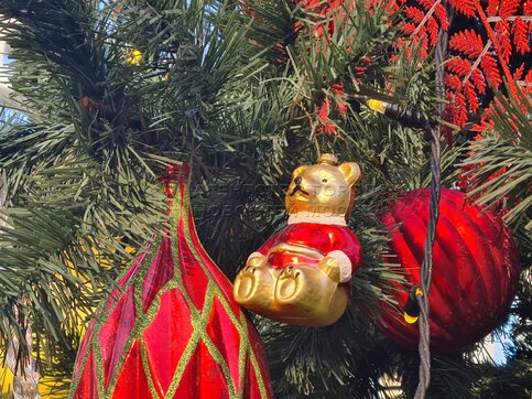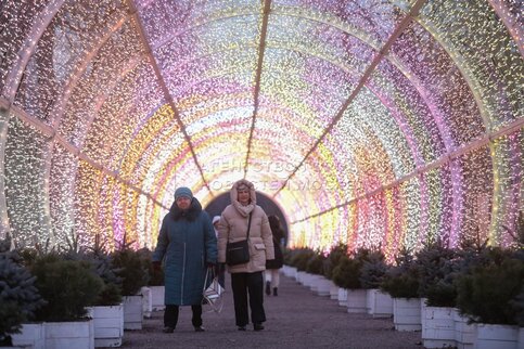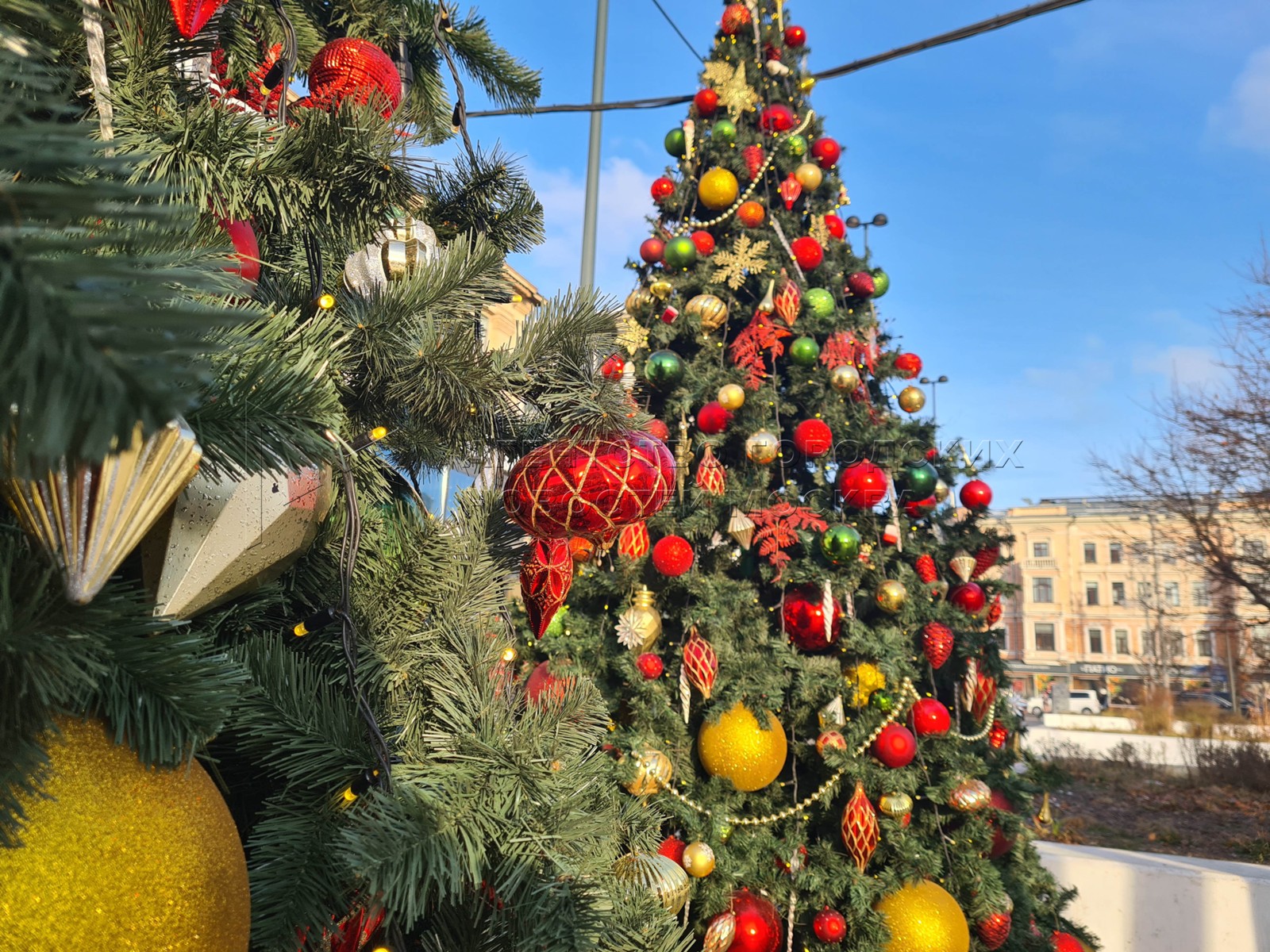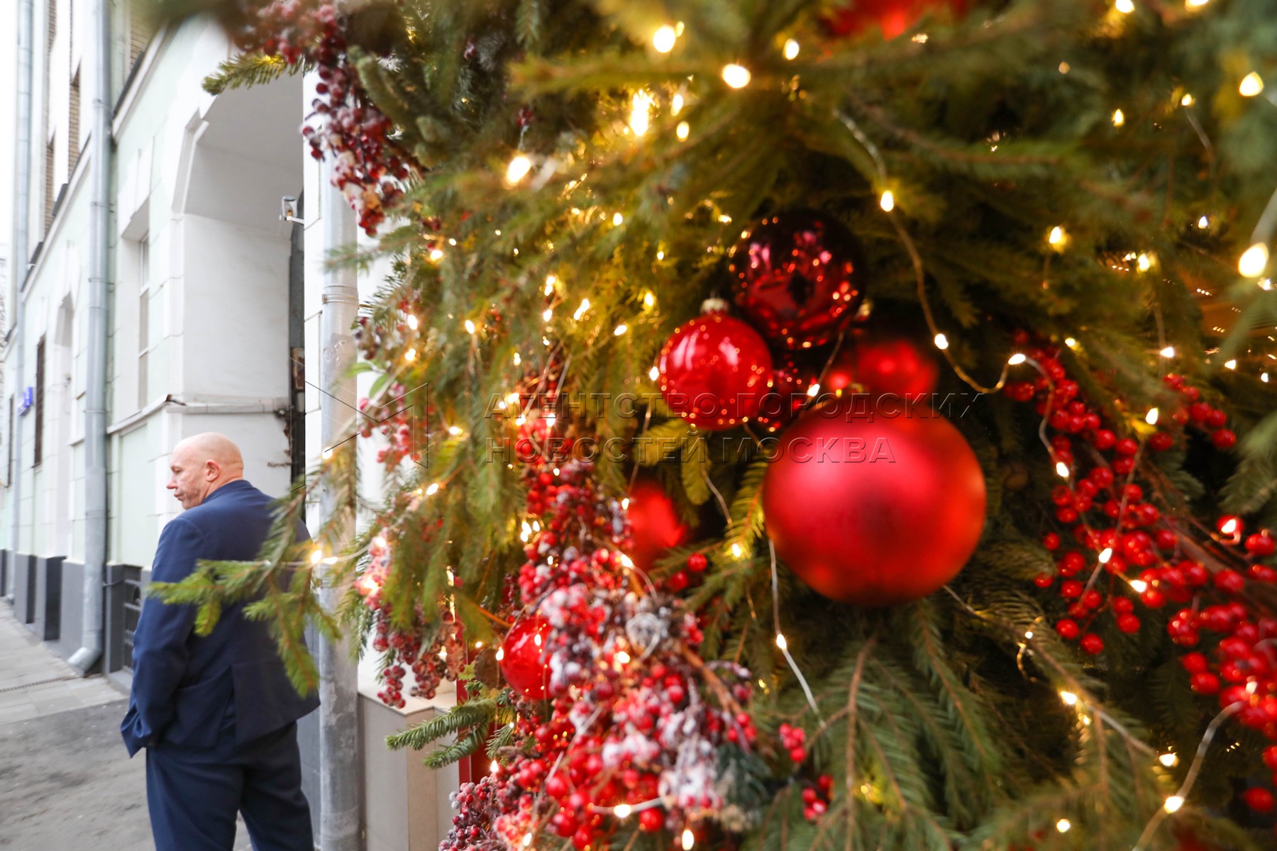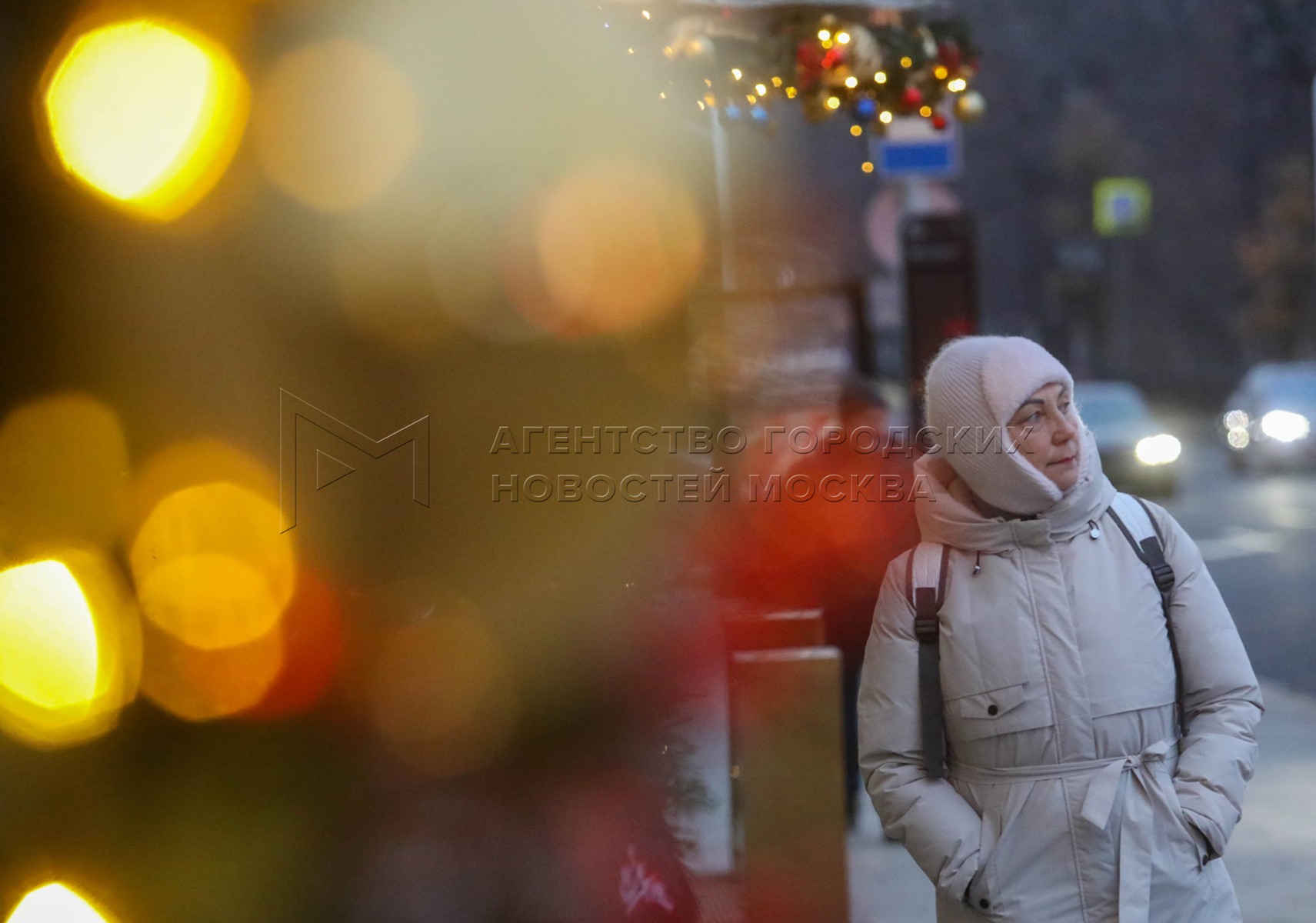 Горожанка возле Новогодней елки. Новогоднее оформление улиц Москвы.