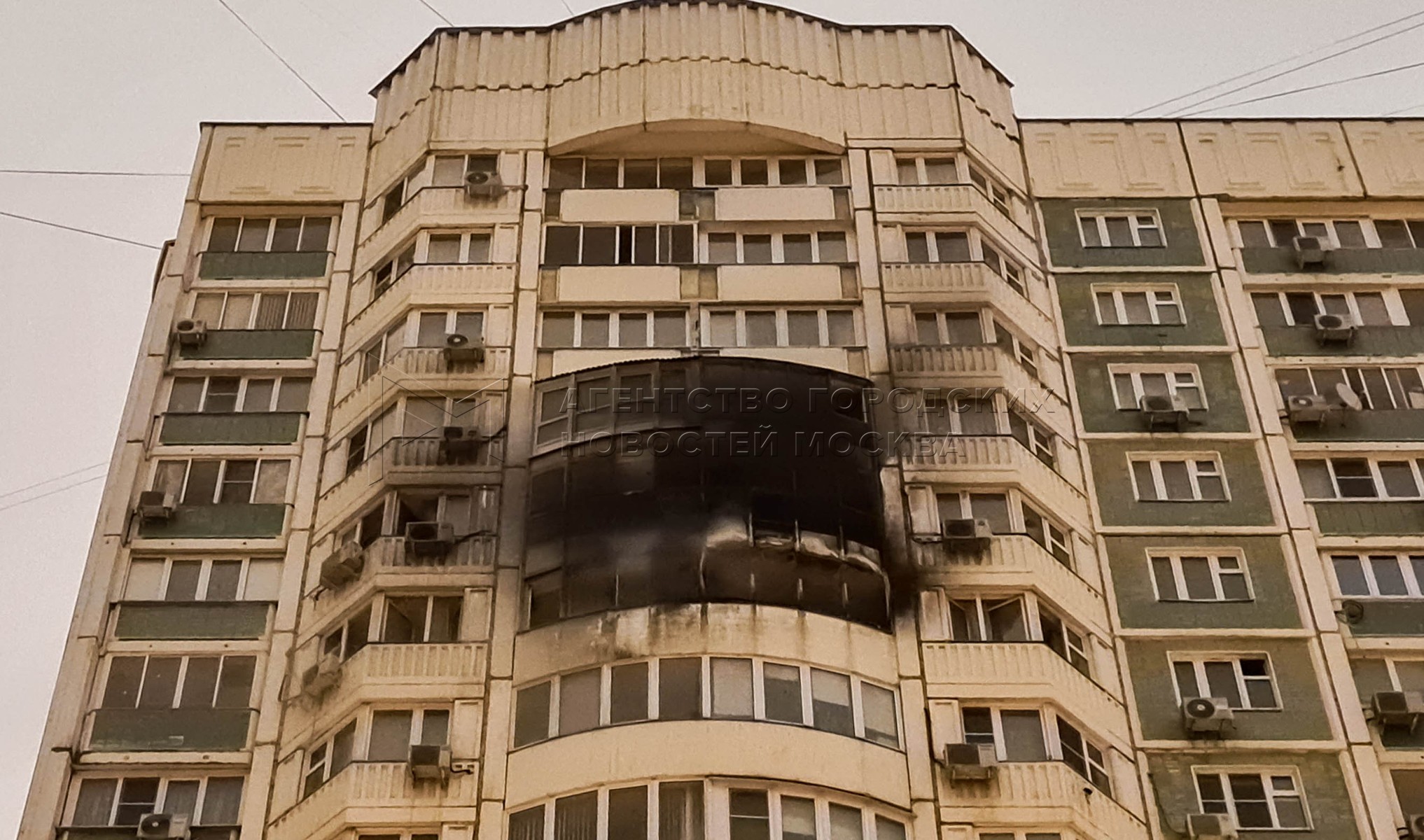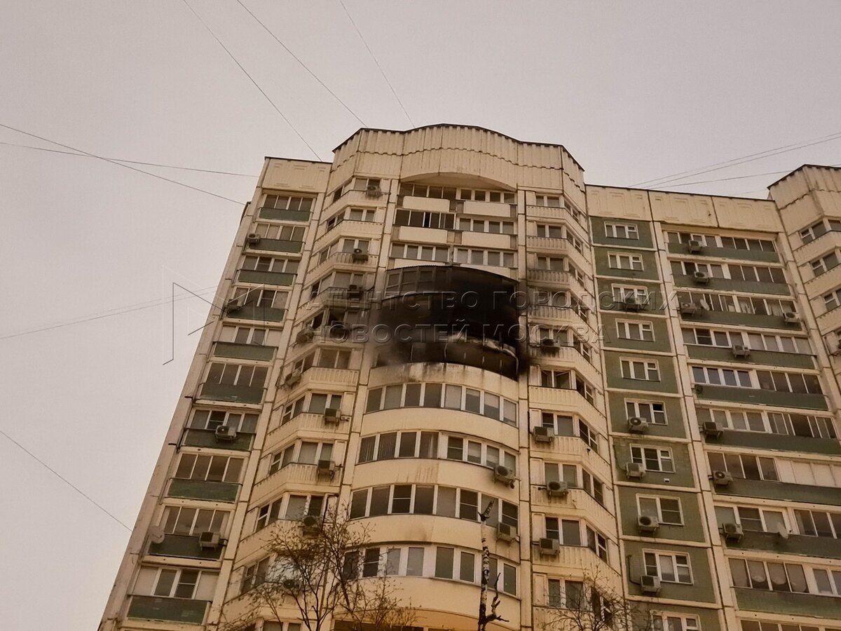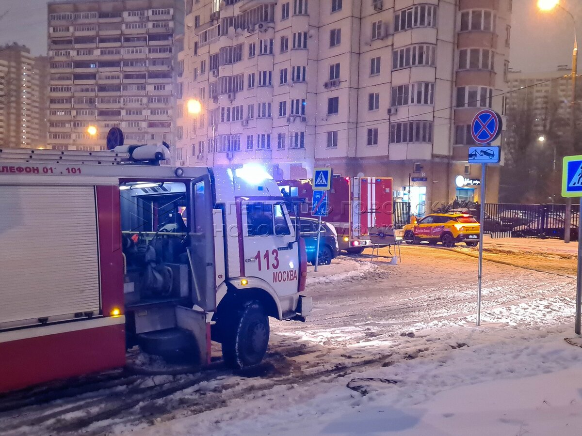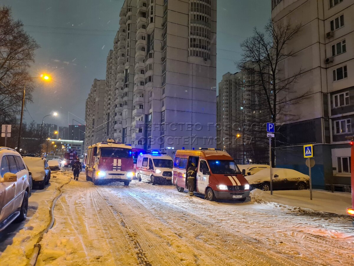 Пожарные расчеты на месте возгорания в квартире на 13 этаже 17-этажного жилого дома на ул. Новаторов в Юго-Западном административном округе Москвы.