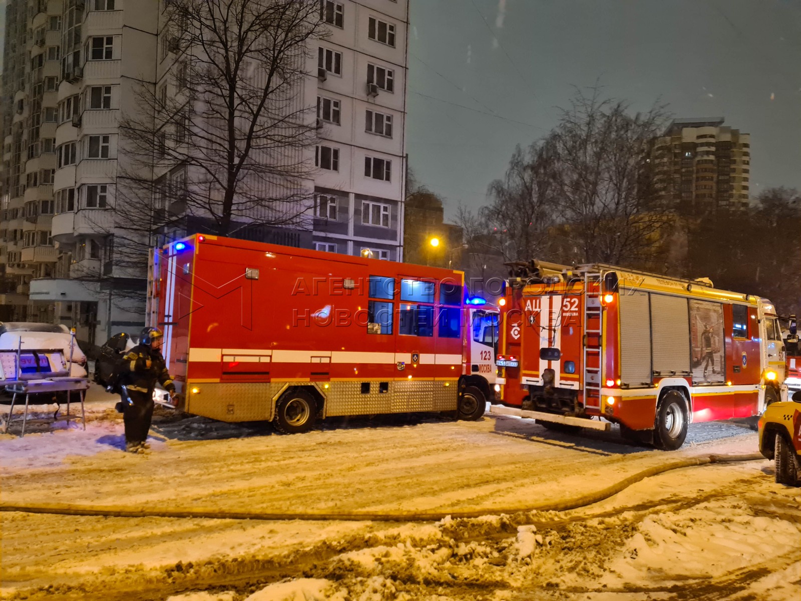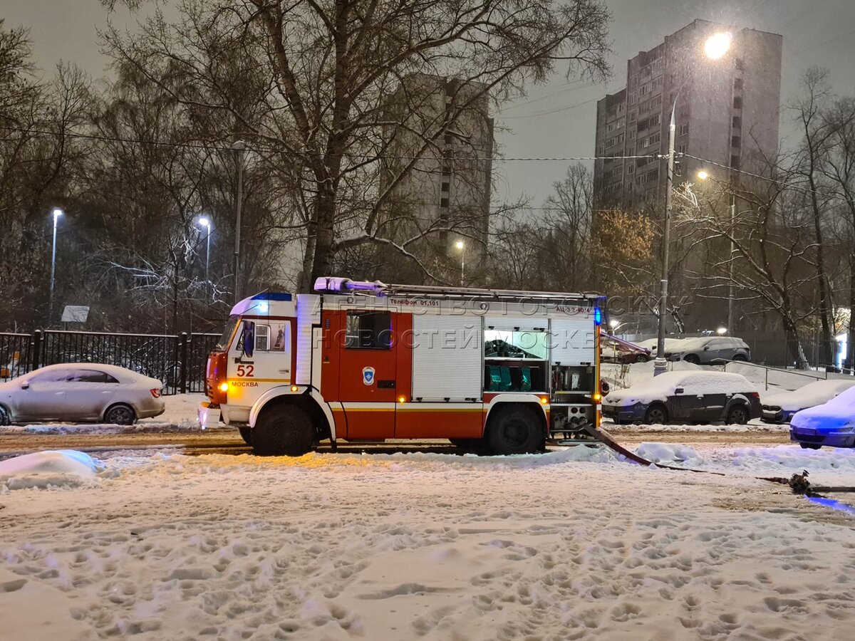 • Заголовок: Пожарные расчеты на месте возгорания в квартире жилого дома на юго-западе Москвы