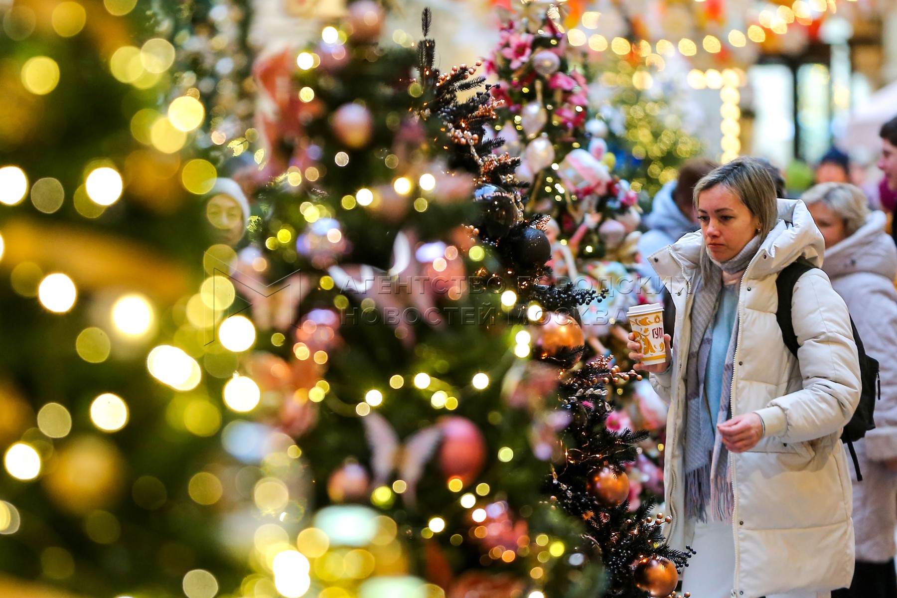 Аллея дизайнерских елей и продажа новогодних елочных украшений и игрушек в ГУМ.