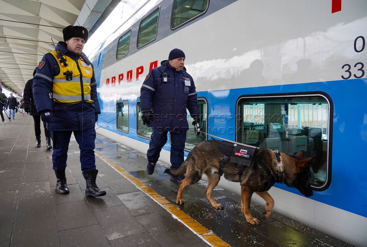 Кинолог с собакой во время осмотра поезда. Презентация новых вагонов двухэтажного...