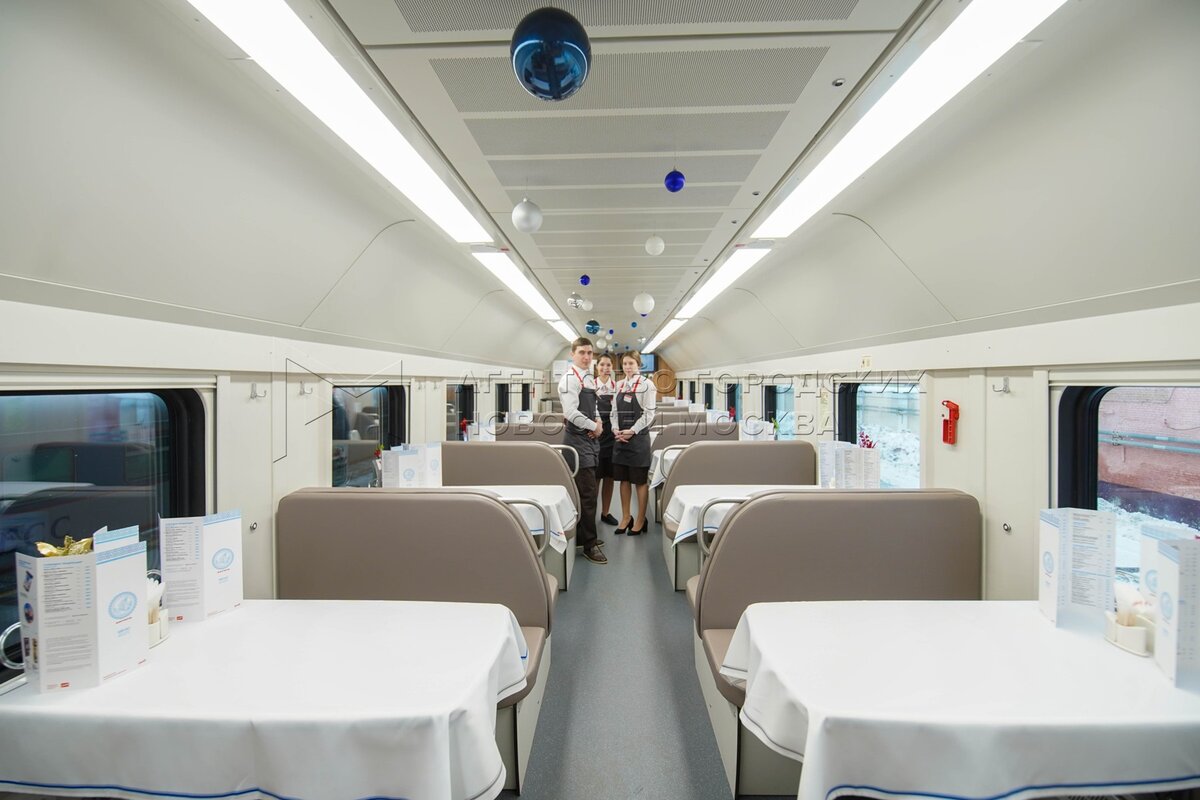 Обеденный зал вагона-бистро. Презентация новых вагонов двухэтажного скоростного поезда «Аврора» на Ленинградском вокзале.