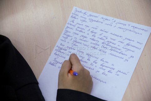Ученица пишет письмо участникам СВО. Сбор новогодних посылок для участников СВО учениками школы №2094, расположенной по адресу: пос. завода Мосрентген, д. 38.