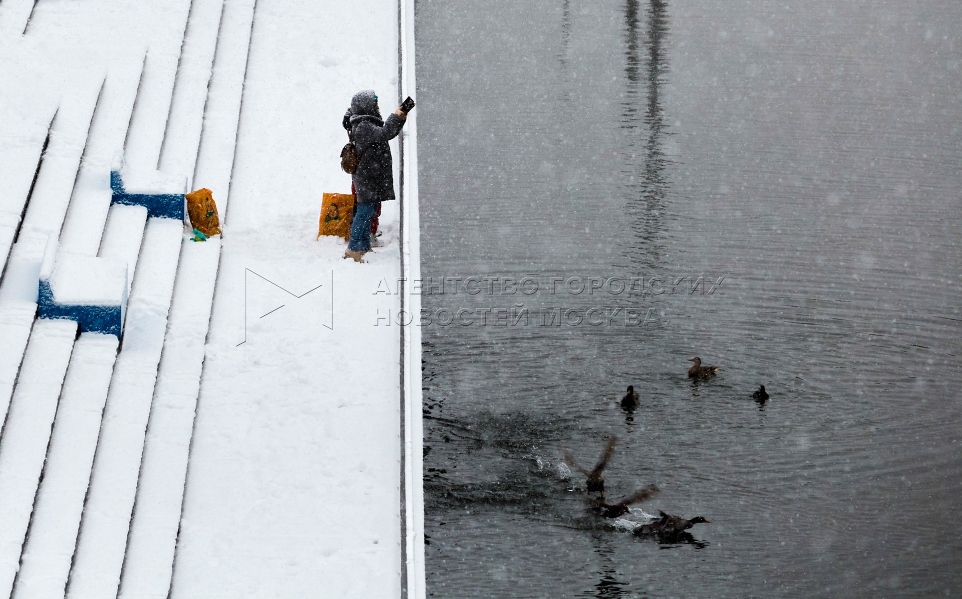 Женщина кормит уток в снегопад 1 января 2025 года.