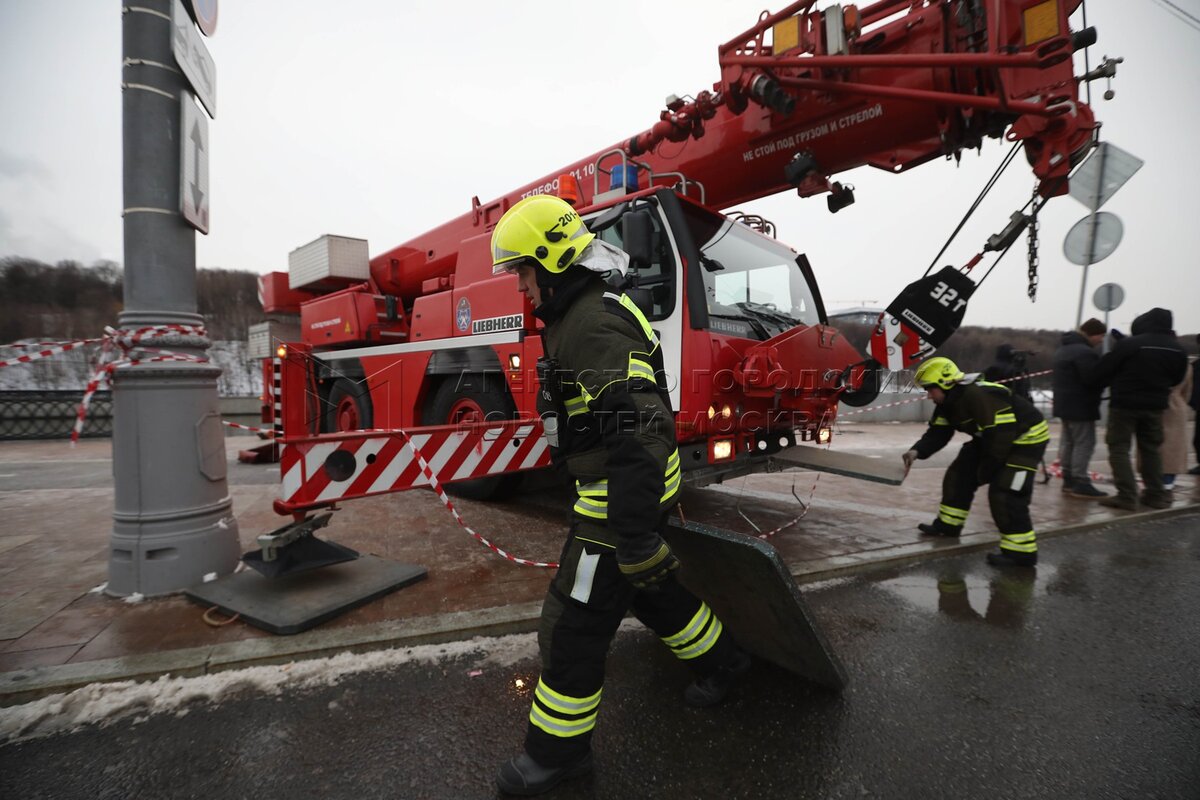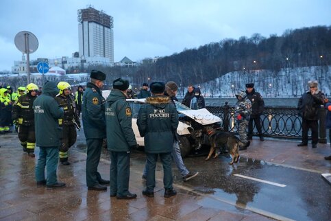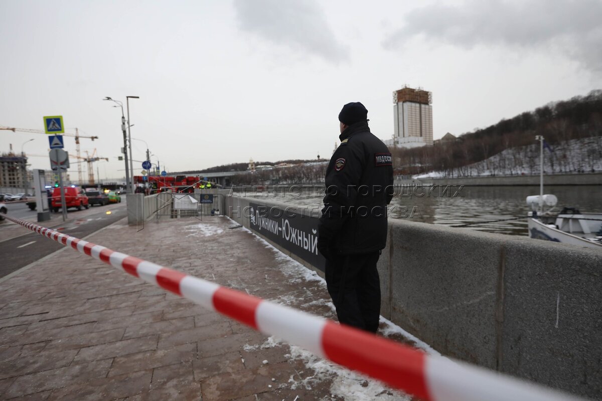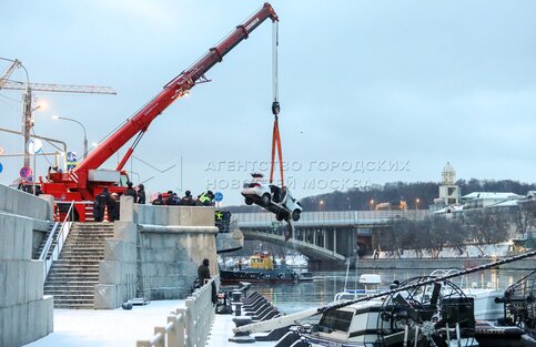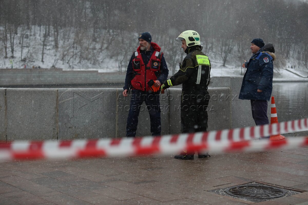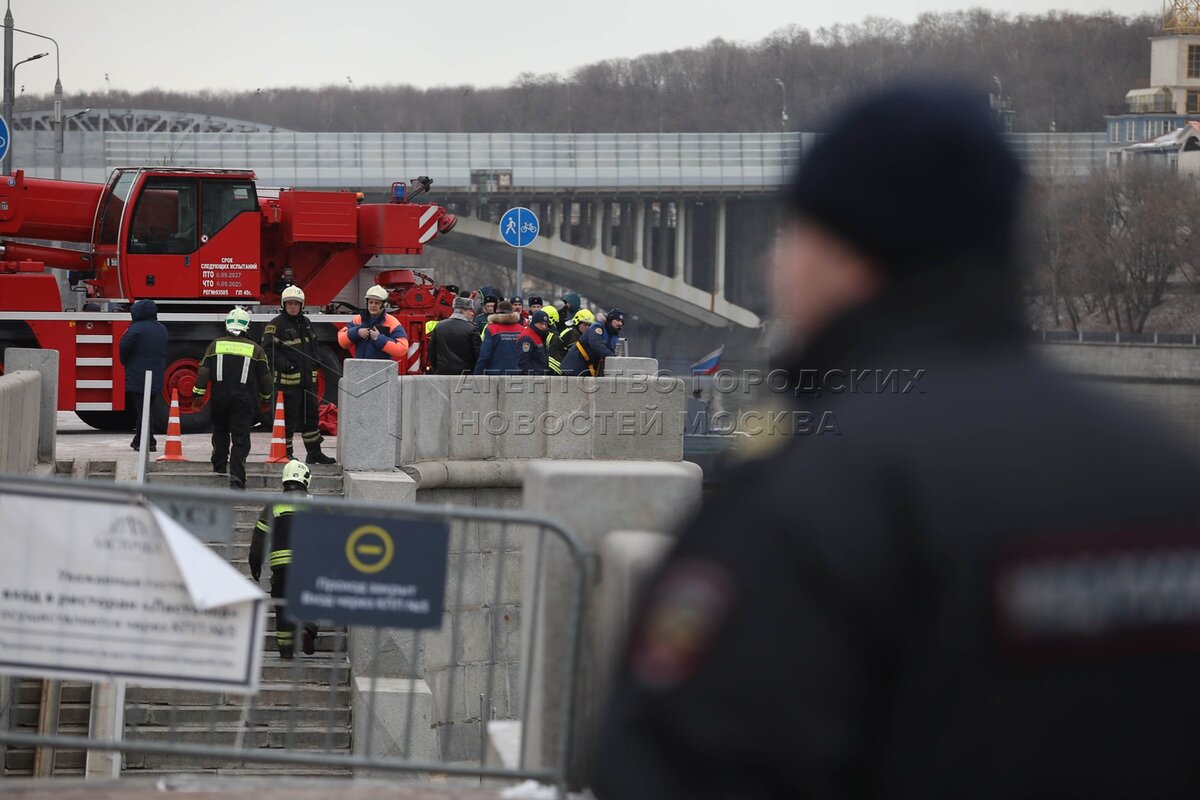 - Заголовок: Оперативные службы на месте падения автомобиля в Москву-реку в районе Лужнецкой набережной