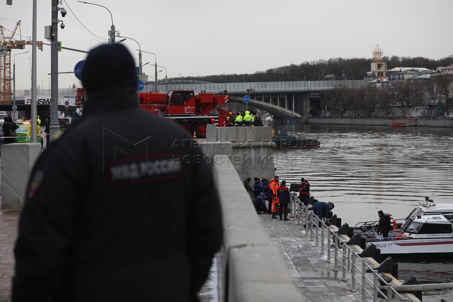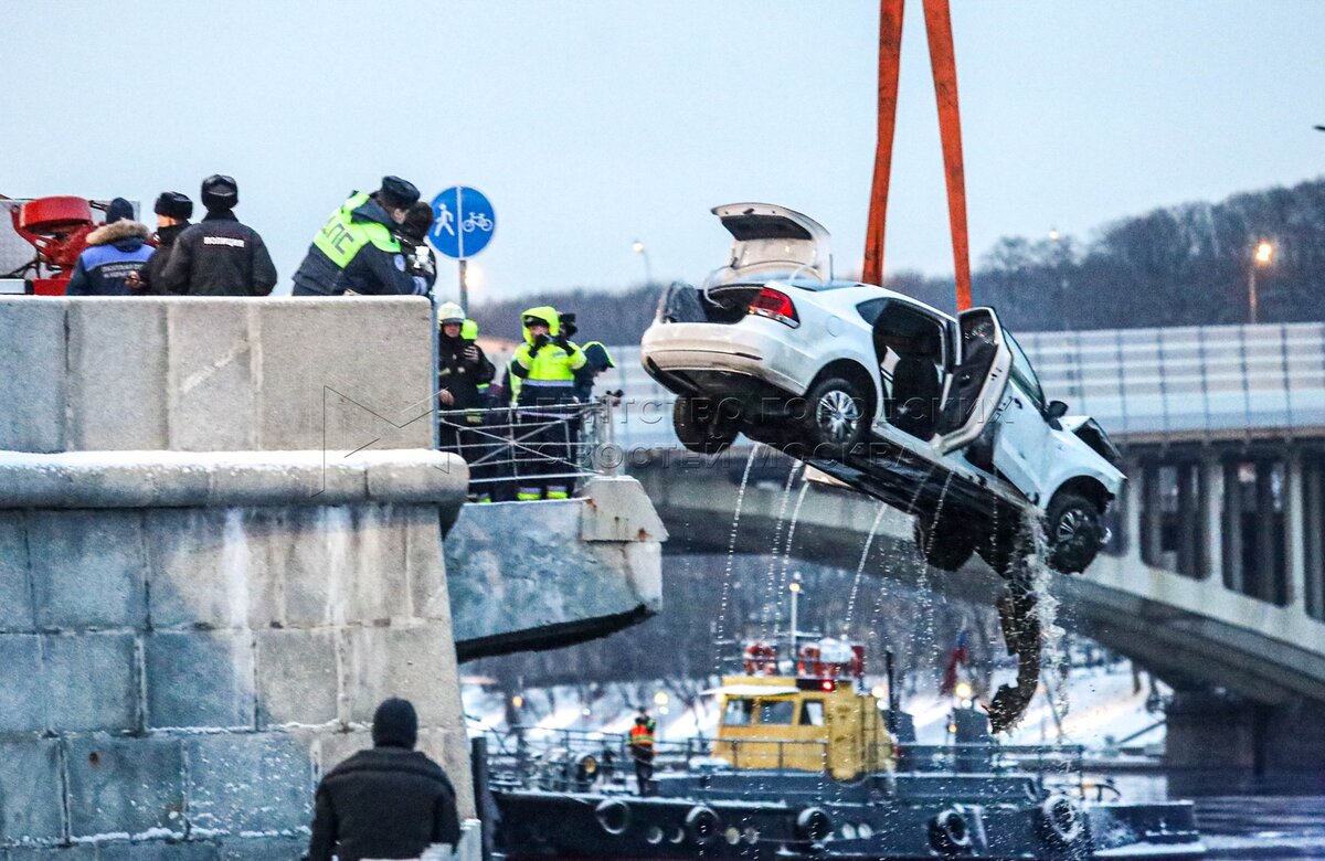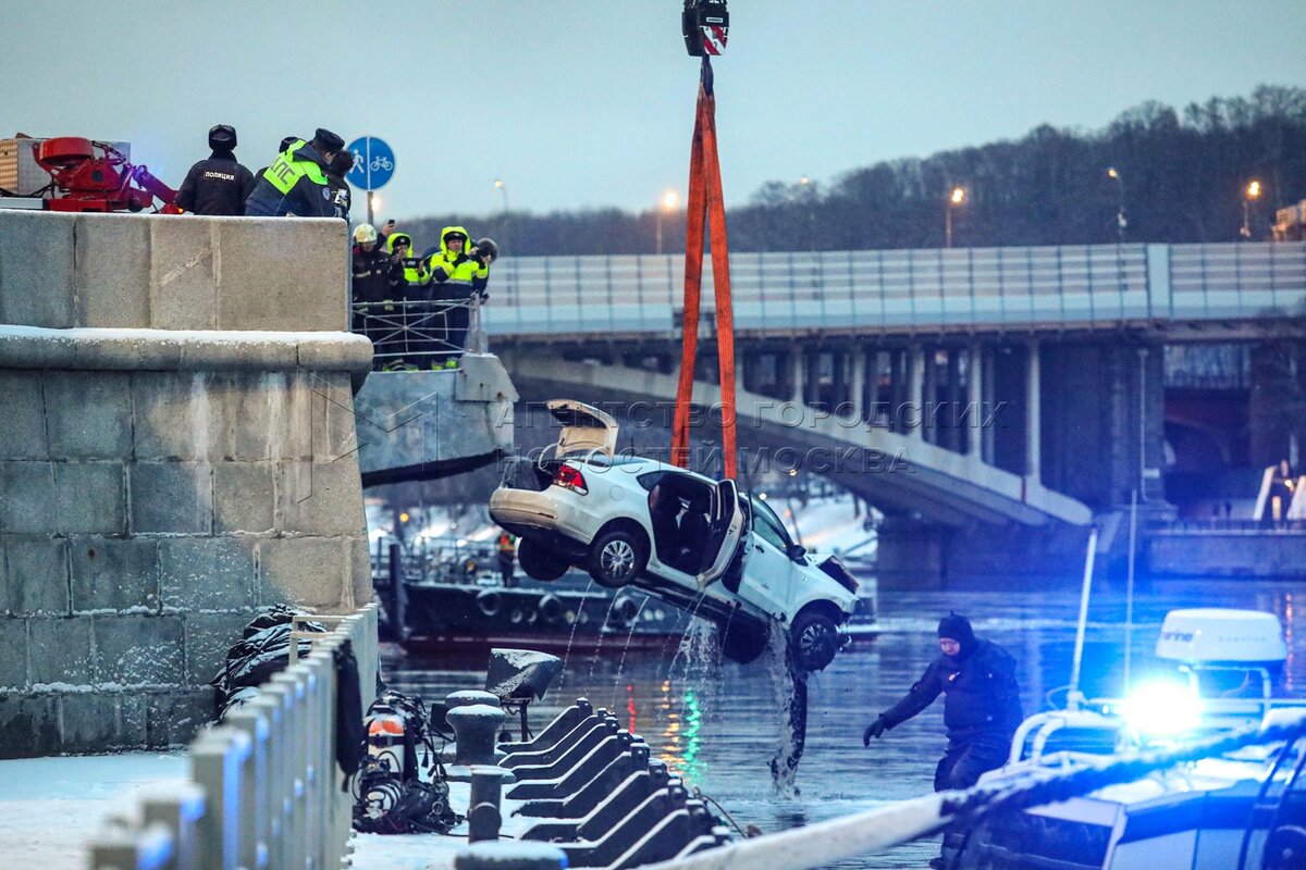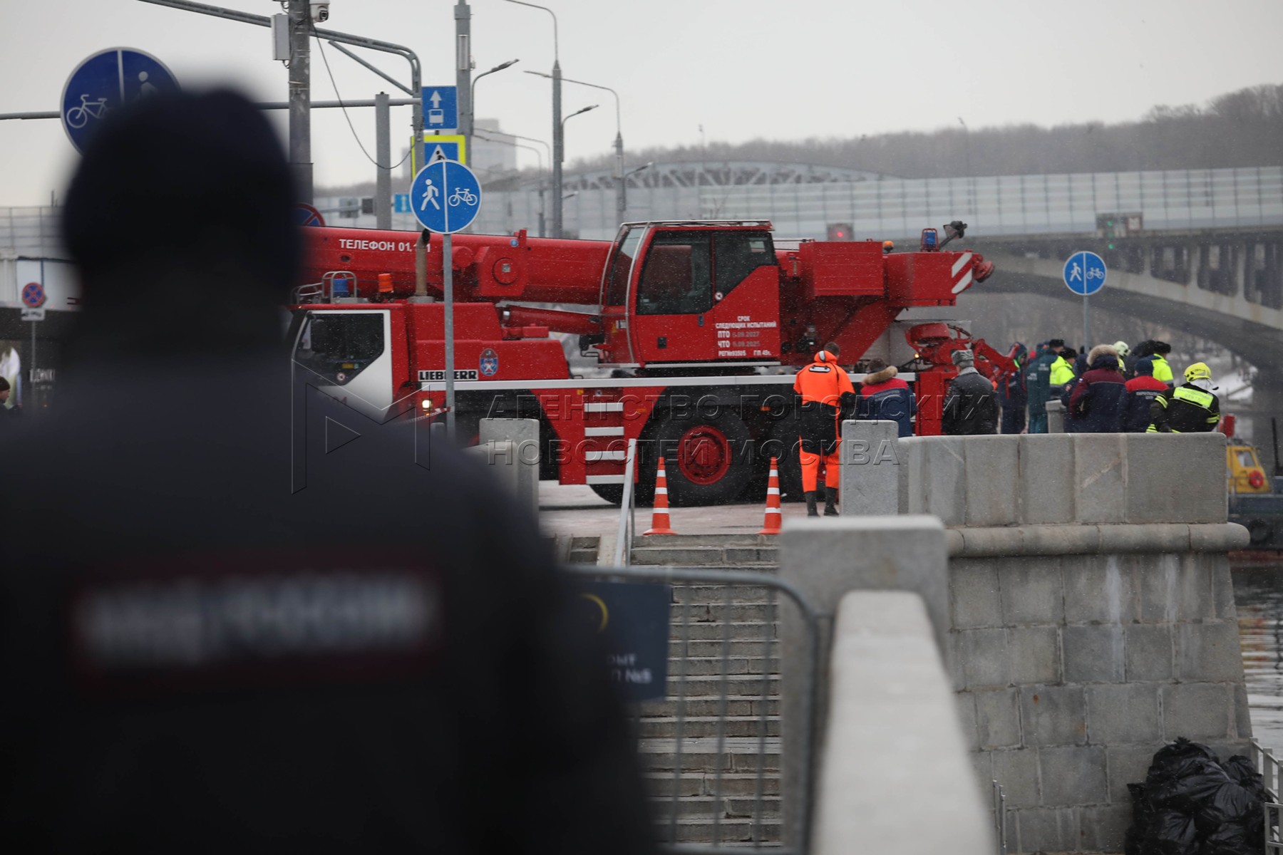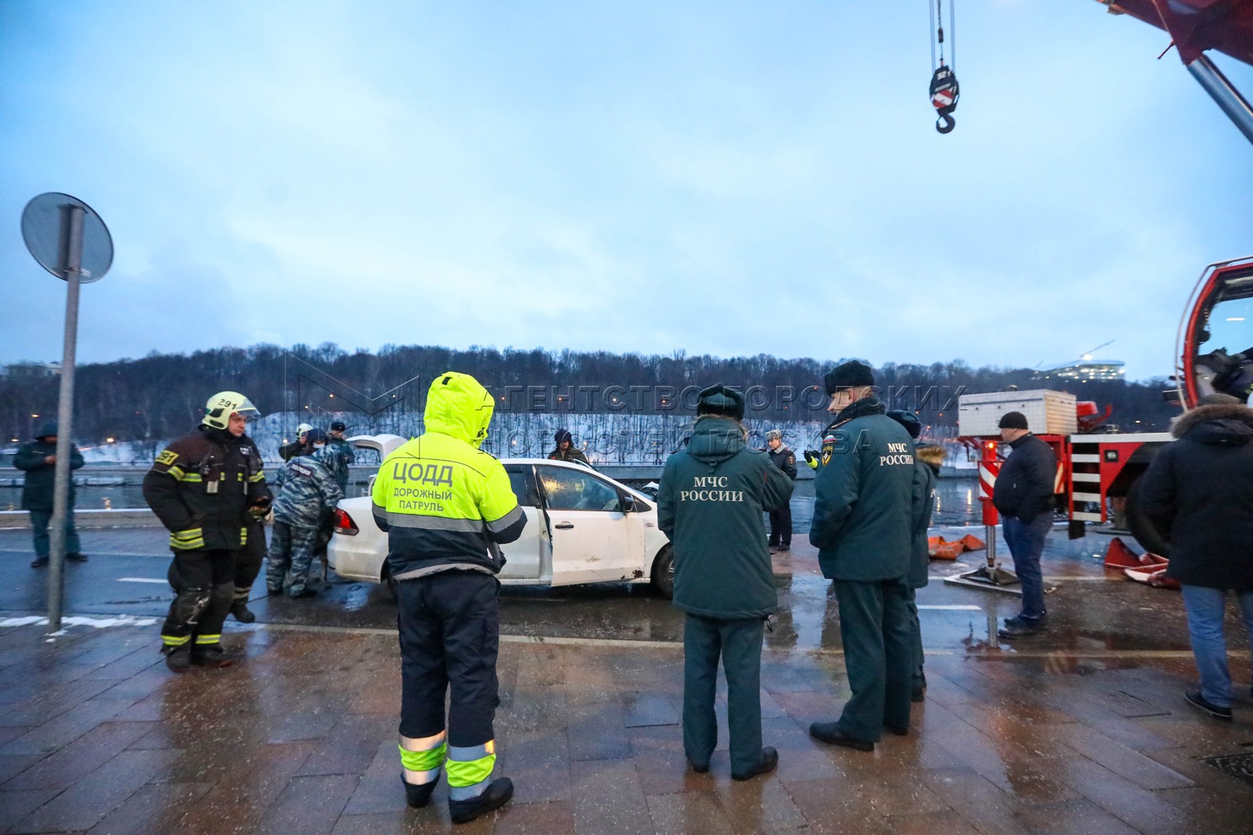 Оперативные службы на месте падения автомобиля в Москву-реку в районе Лужнецкой набережной.