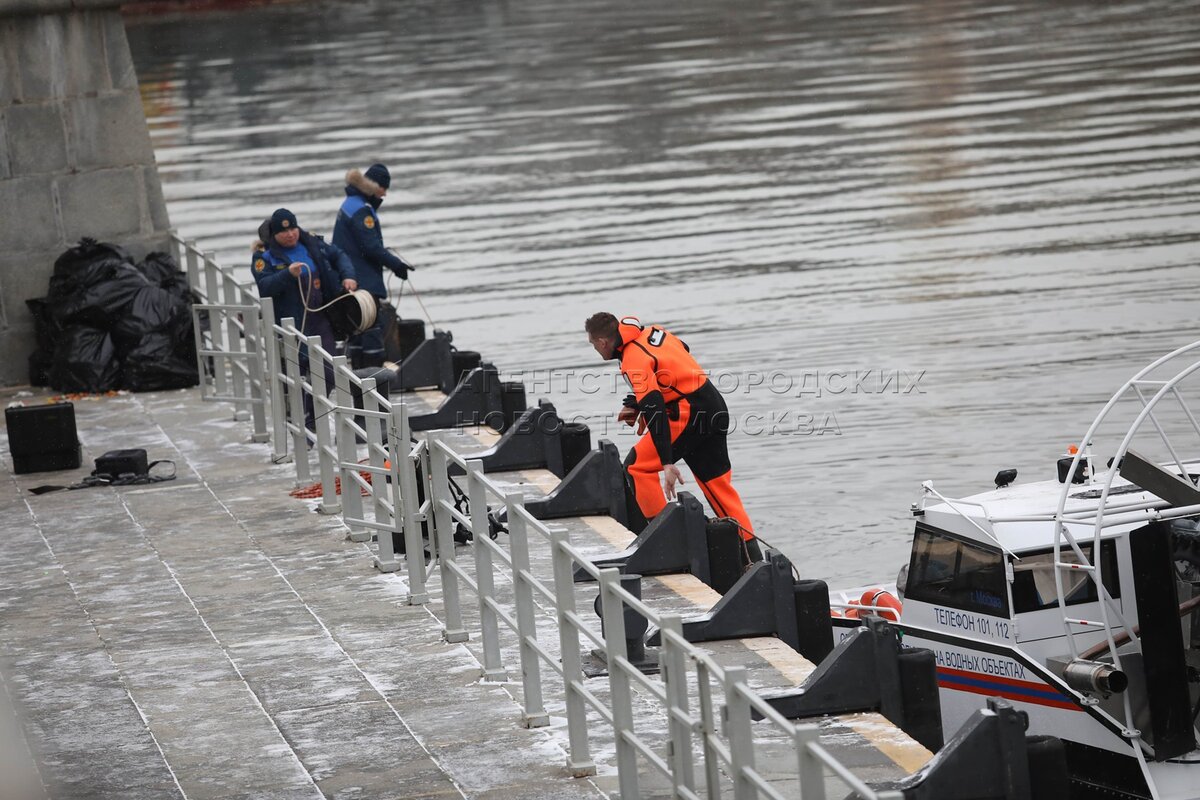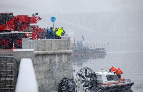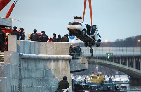- Описание: Оперативные службы на месте падения автомобиля в Москву-реку в районе Лужнецкой набережной.