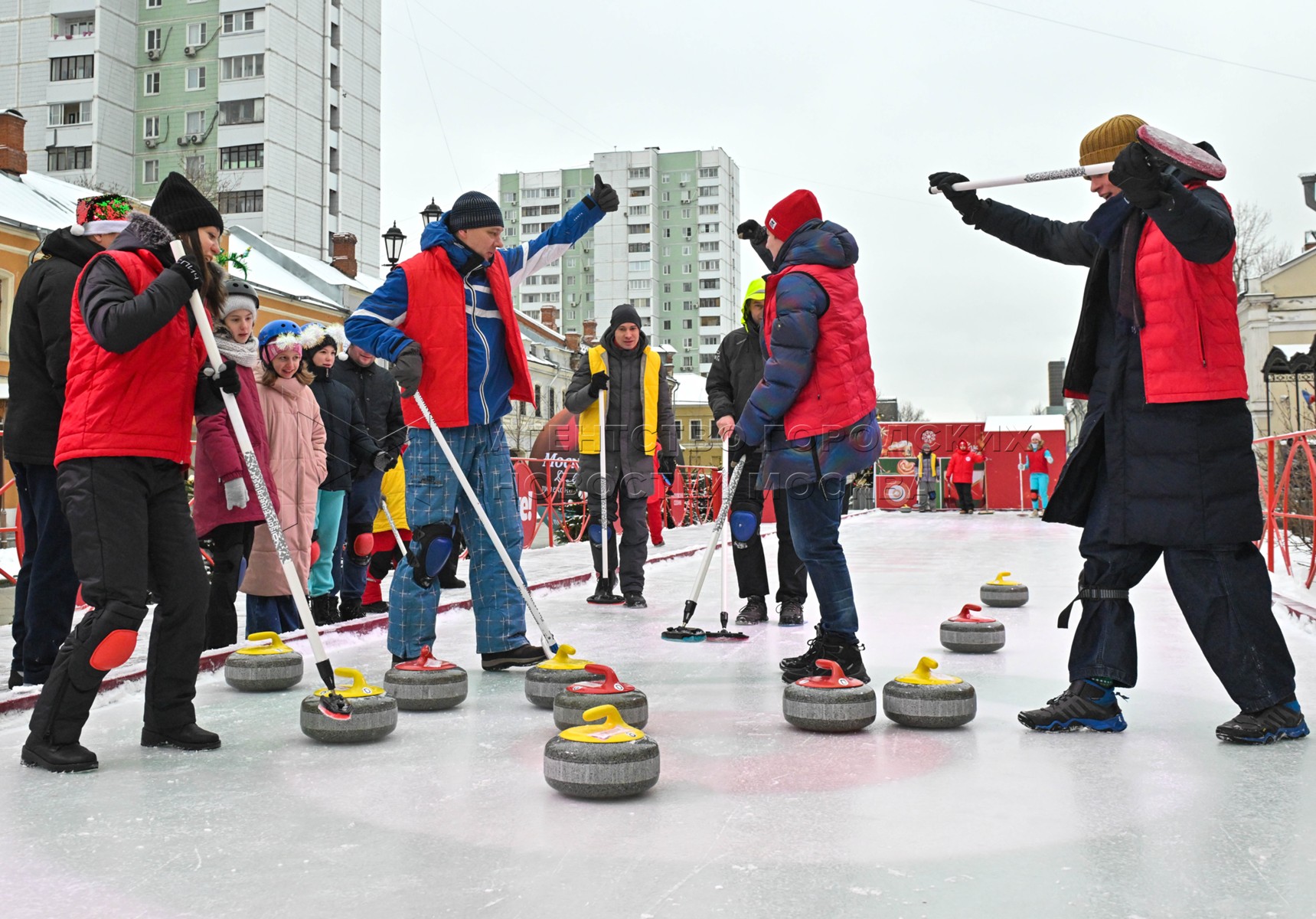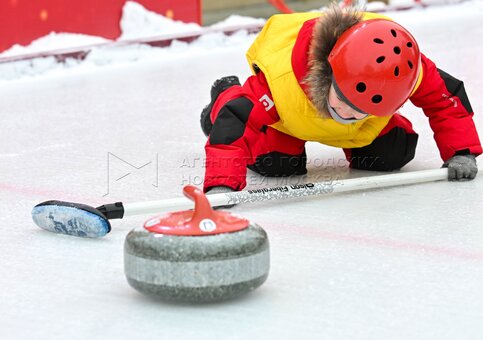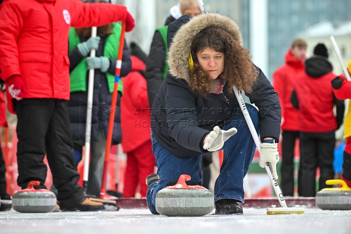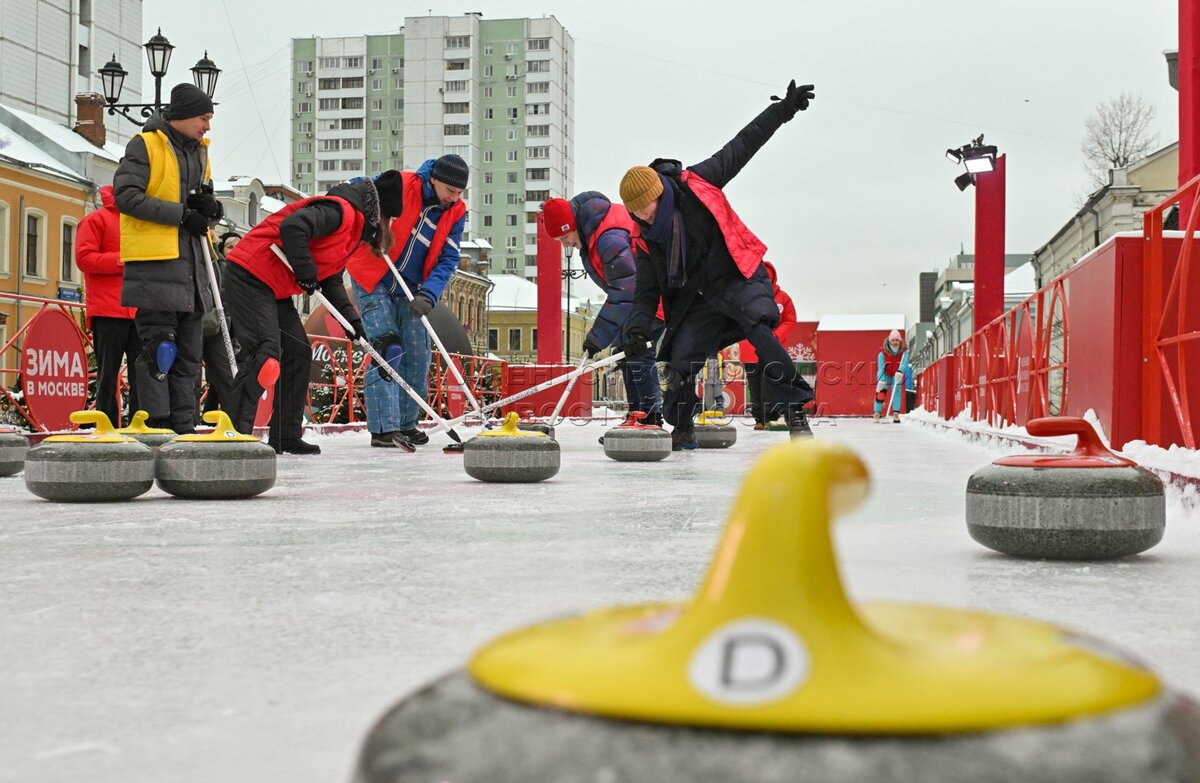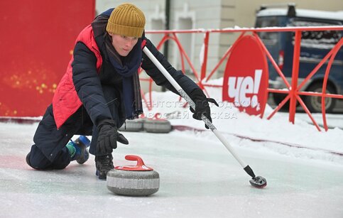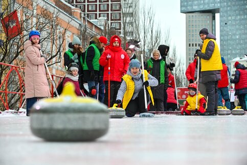 Турнир по керлингу, в котором приняли участие семьи защитников Родины, находящихся в зоне СВО, на бесплатной площадке для игры в керлинг с двумя дорожками на ул. Школьная в рамках фестиваля «Путешествие в Рождество» проекта «Зима в Москве».