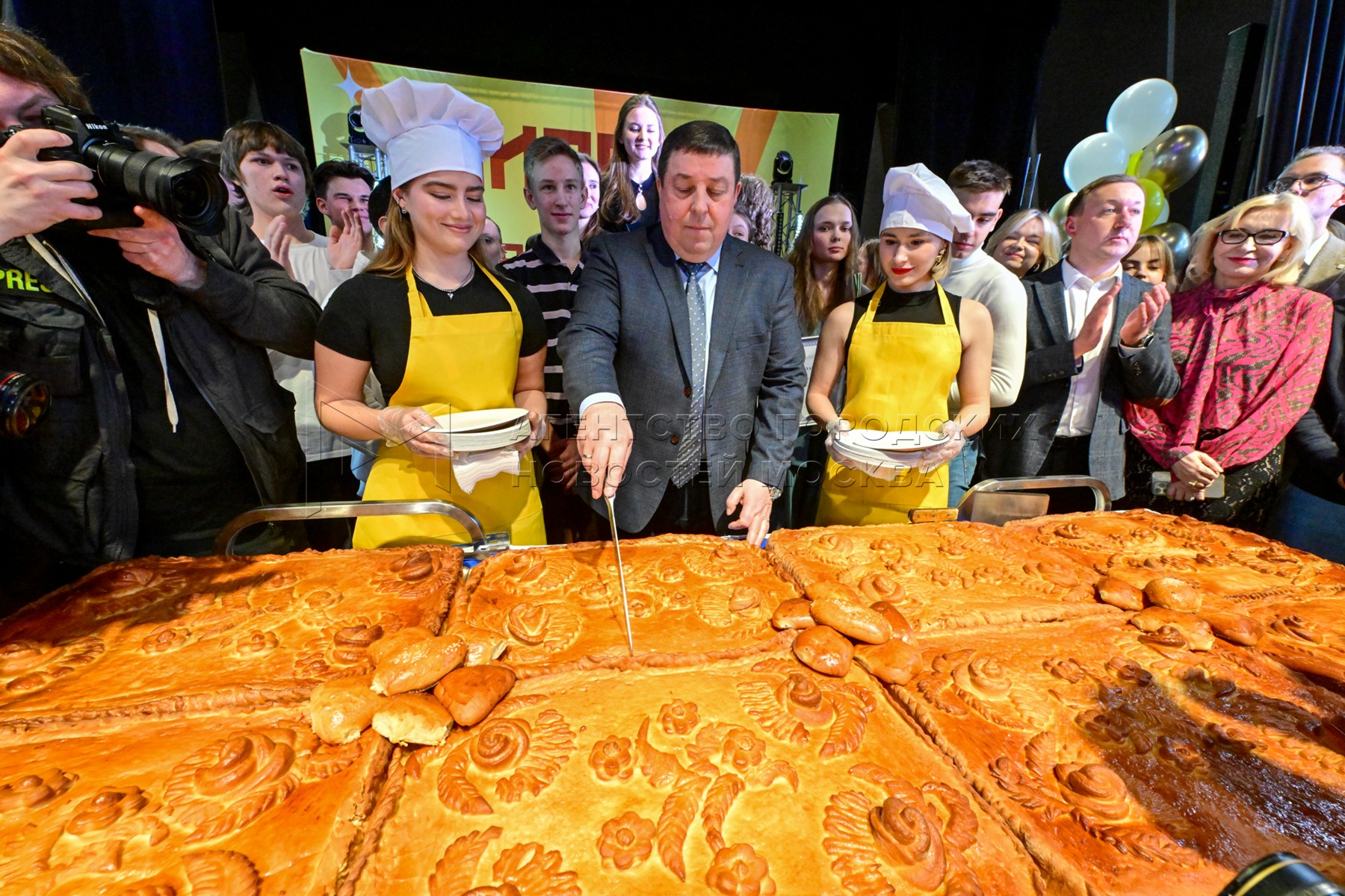Ректор Первого Московского государственного медицинского университета имени Сеченова Петр Глыбочко разрезает 3-метровый пирог, который был испечен ко Дню российского студенчества.