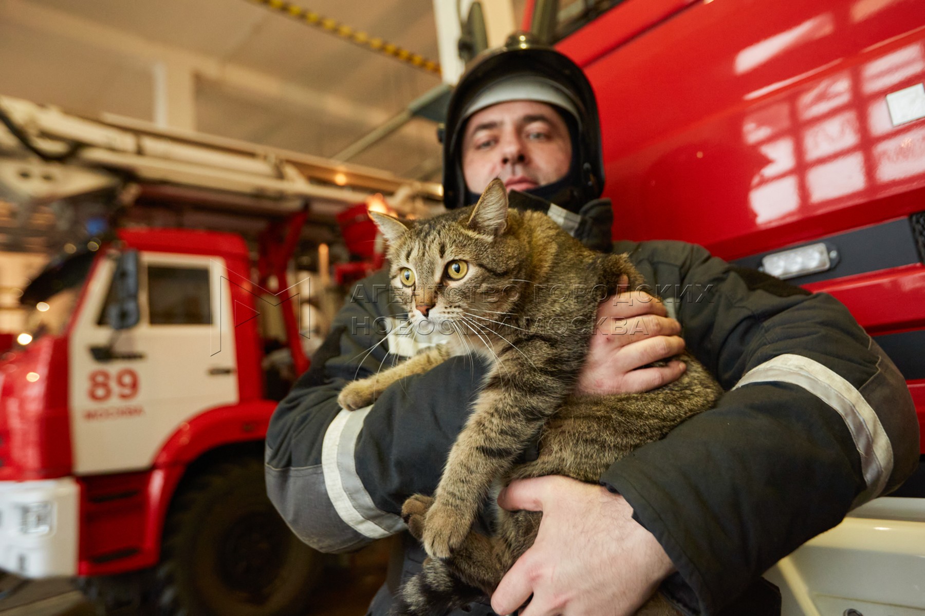 Пожарный 89-ой пожарной части, прапорщик внутренней службы Дмитрий Рыбаков и кот-...