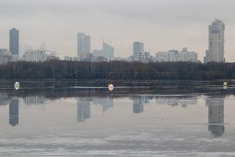 Тающий лед на Строгинском затоне в теплую погоду 29 января 2025 года.