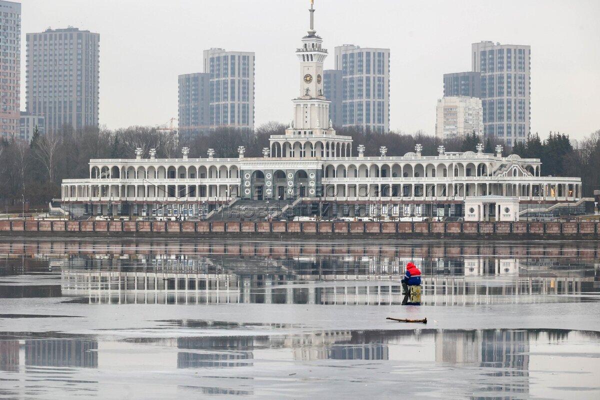 Рыбак на тающем льду Канала Москвы у Северного речного порта в теплую погоду 29 я...