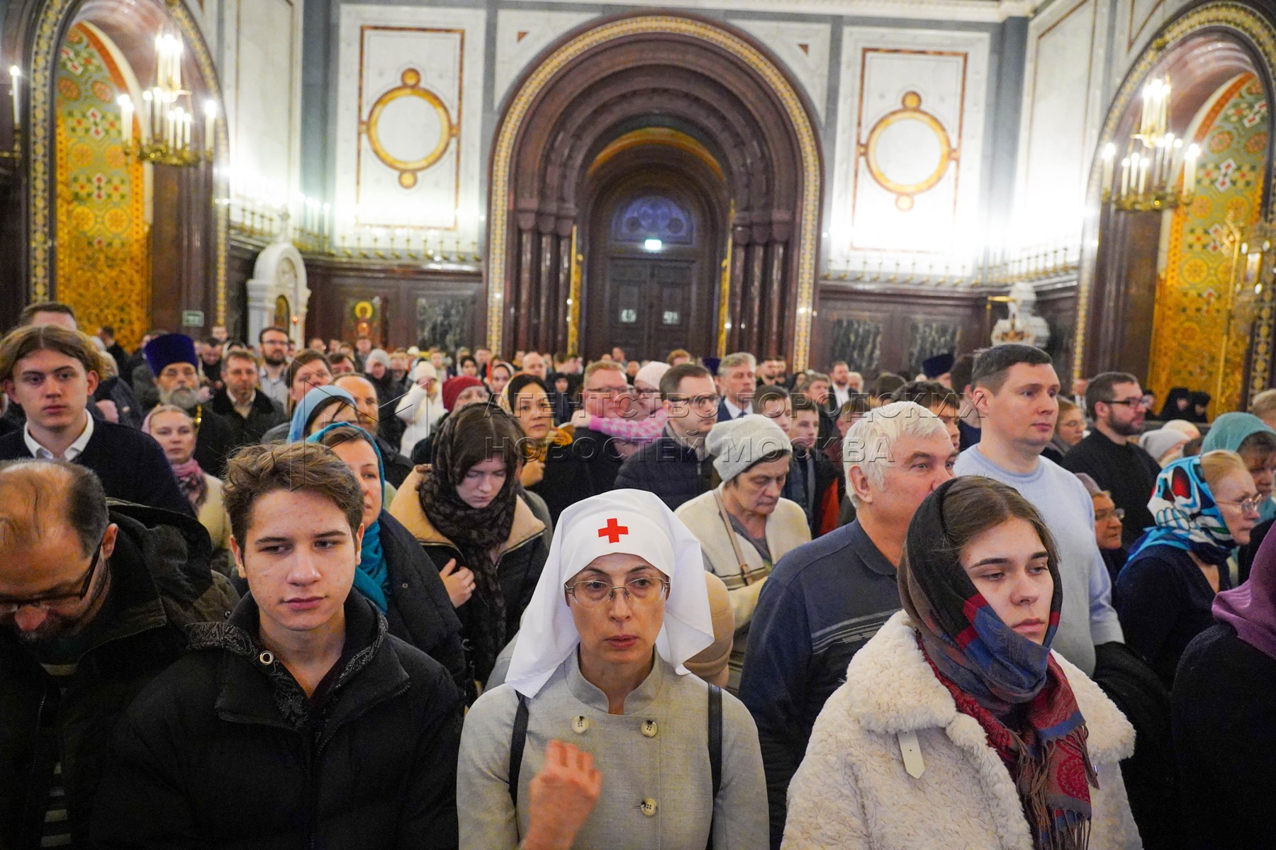 Святейший Патриарх Московский и всея Руси Кирилл во время богослужения в 16-ю годовщину его интронизации в кафедральном соборном храме Христа Спасителя.