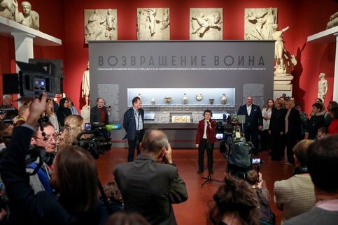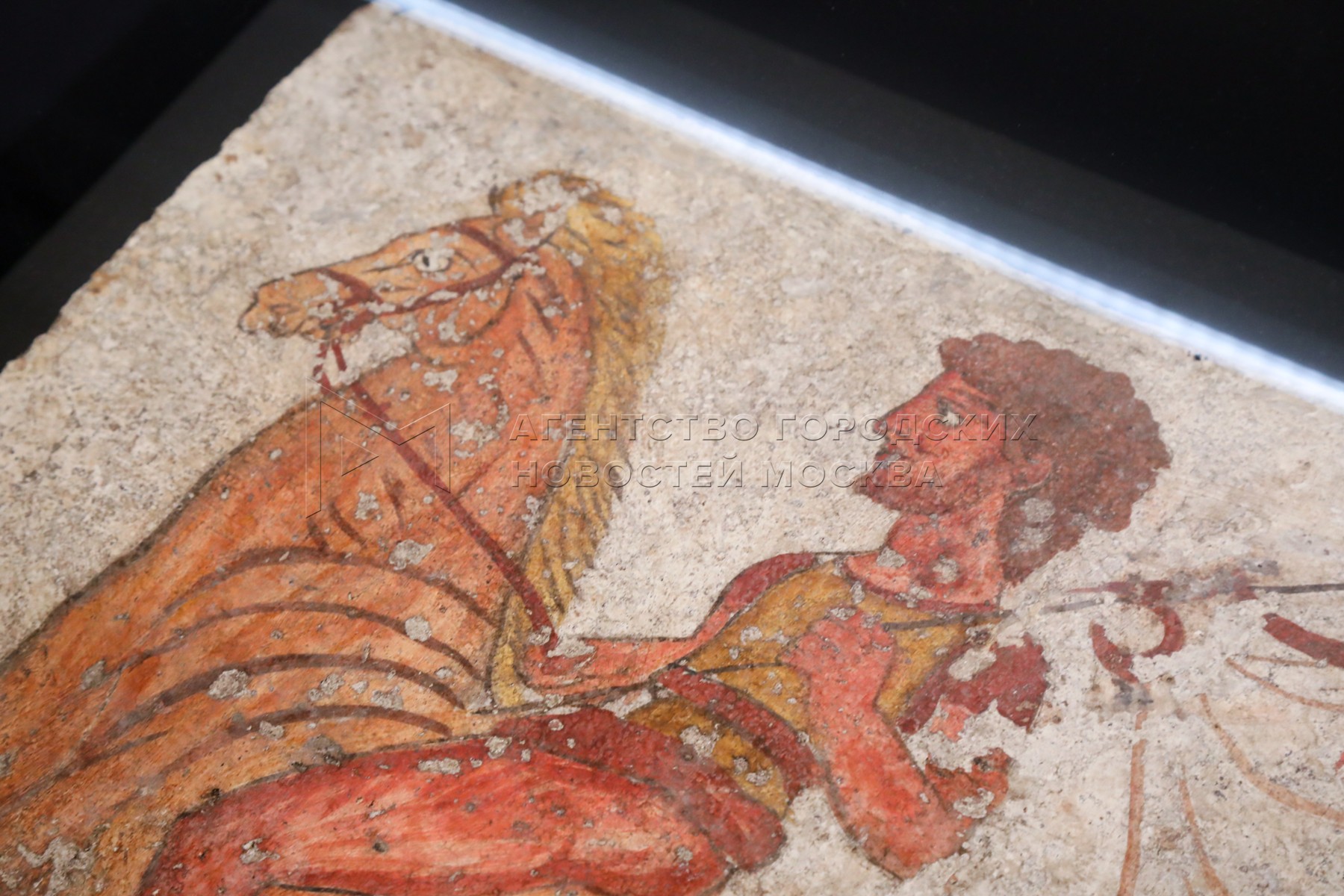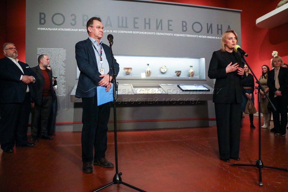 - Описание: Открытие выставки «Возвращение воина. Уникальная италийская фреска IV века до нашей эры из собрания Воронежского областного художественного музея имени Крамского» в Государственном музее изобразительных искусств имени Пушкина.