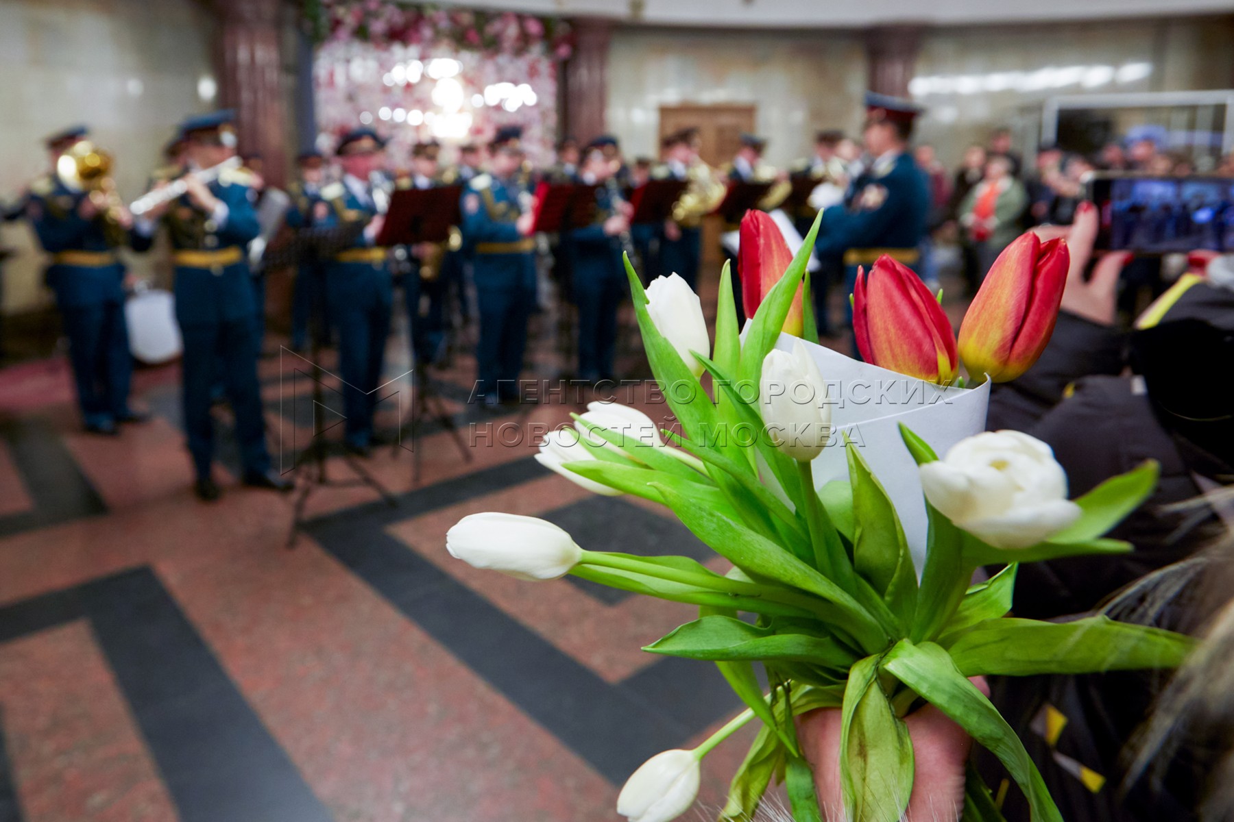 Поздравление пассажирок с Международным женским днем 8 марта на станции метро «Ку...