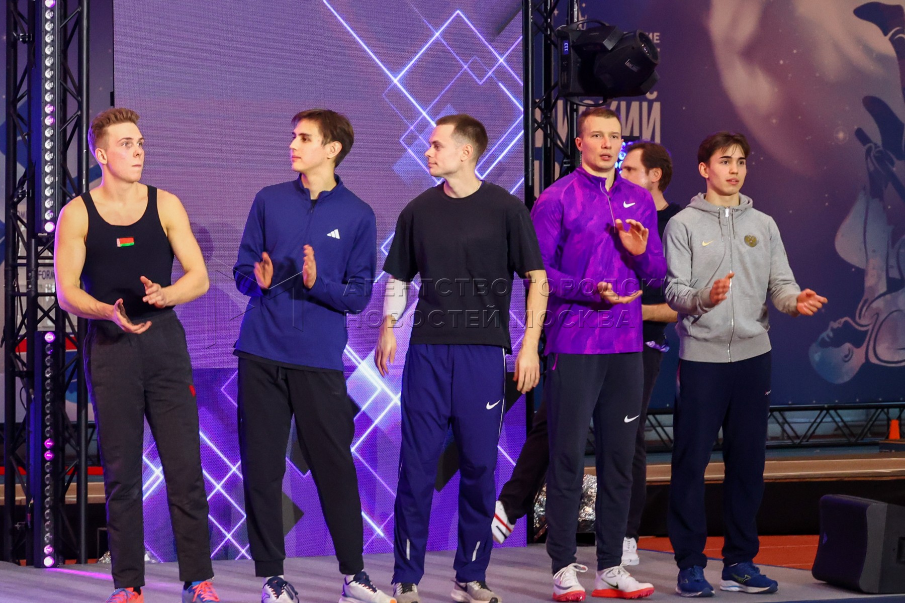 Легкоатлеты Матвей Волков, Михаил Шмыков, Дмитрий Качанов, Георгий Горохов и Ранэль Шафиков (слева направо). V Всероссийский фестиваль прыжков с шестом в спортивном комплексе «Легкоатлетический манеж НИУ МГСУ».
