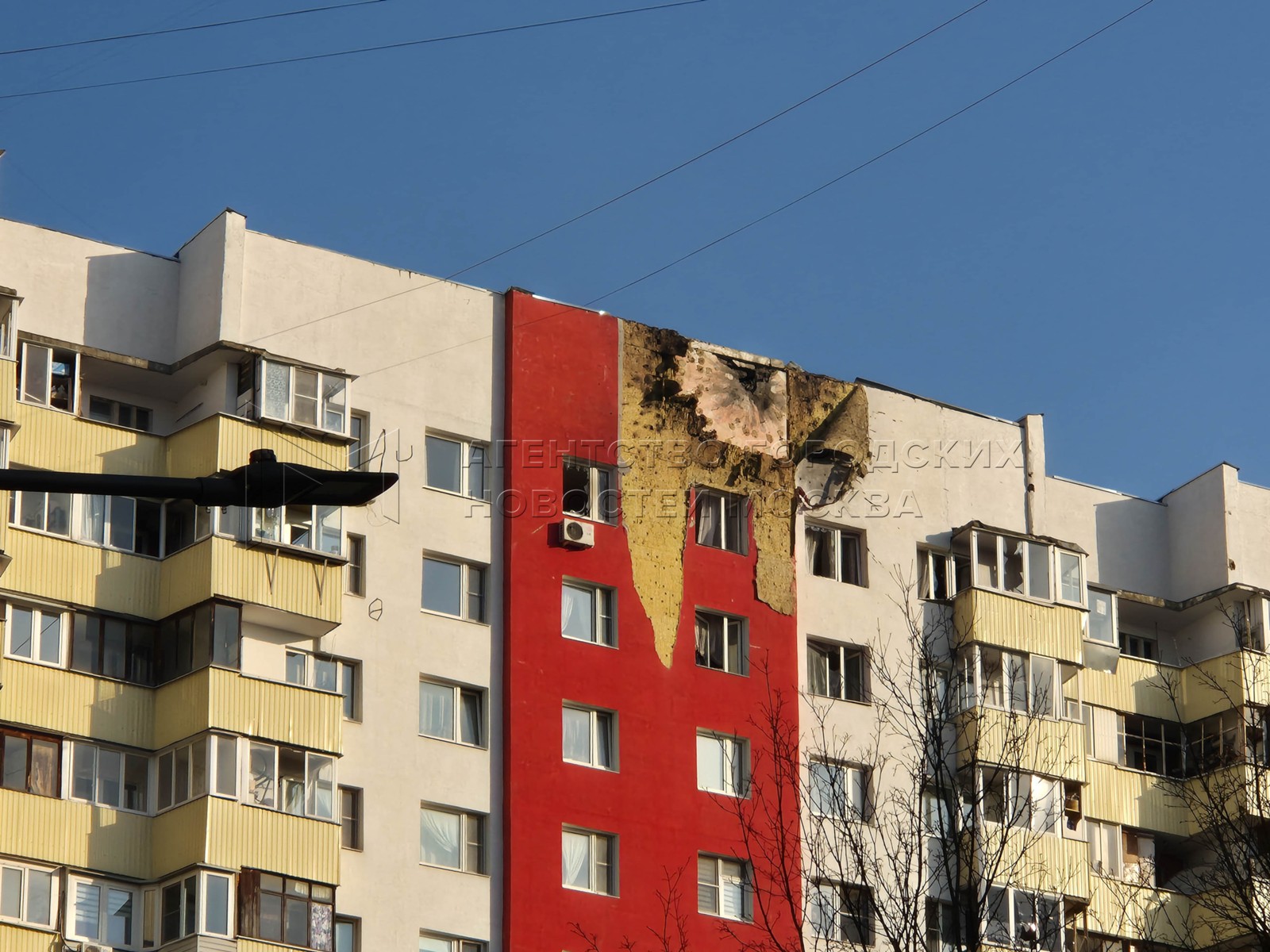 • Заголовок: Оперативные службы у дома на Домодедовской улице, где обломки БПЛА повредили жилой дом