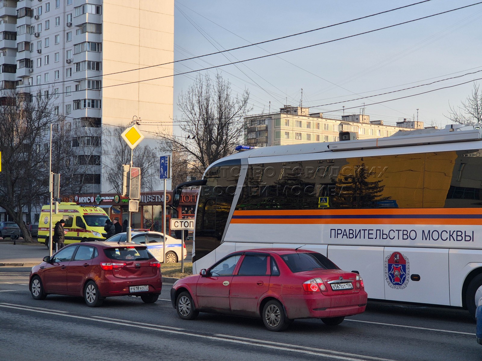 Автобус правительства Москвы у д. 27 на ул. Домодедовская, где обломки БПЛА повре...