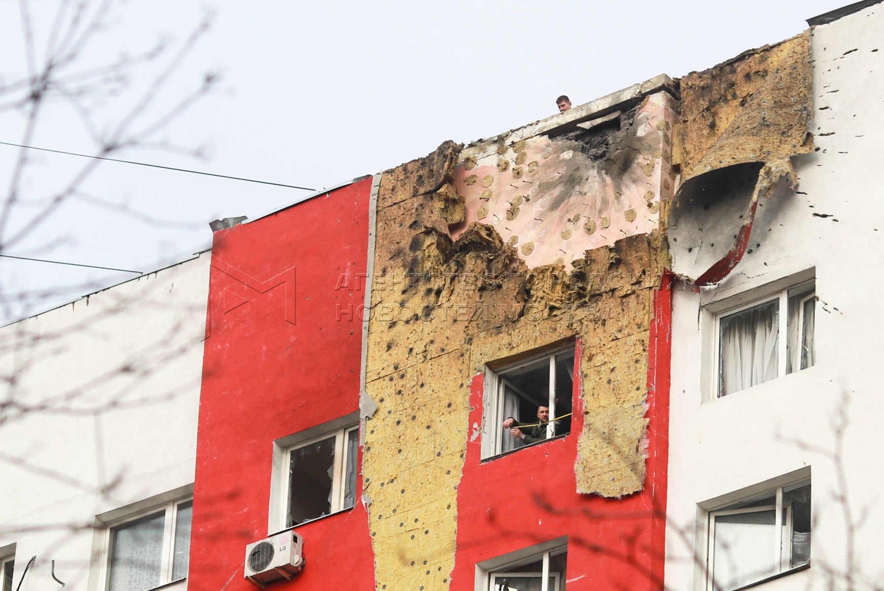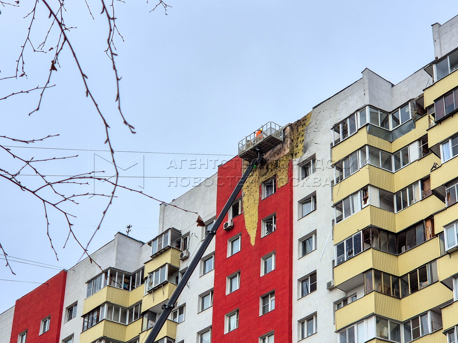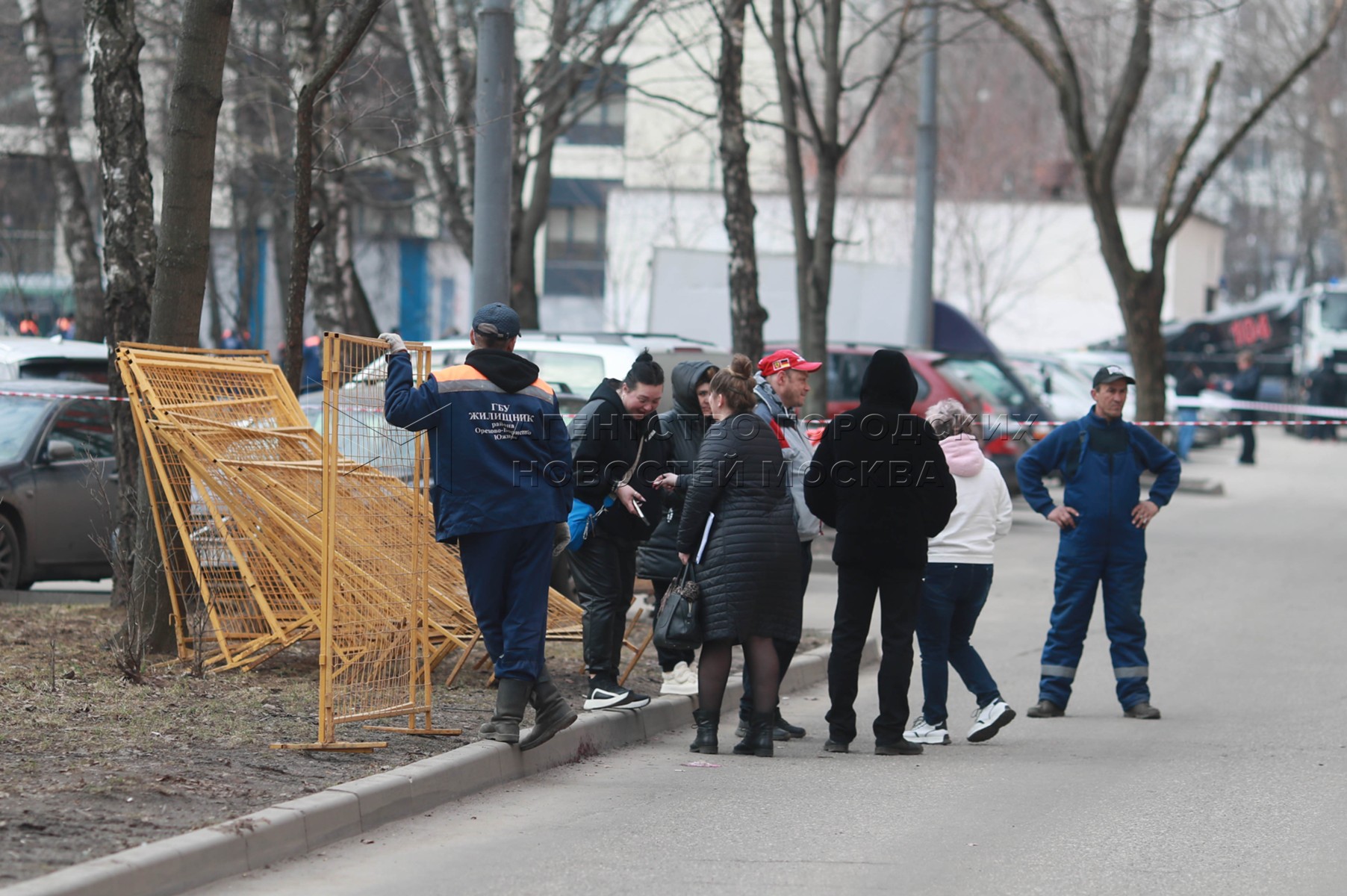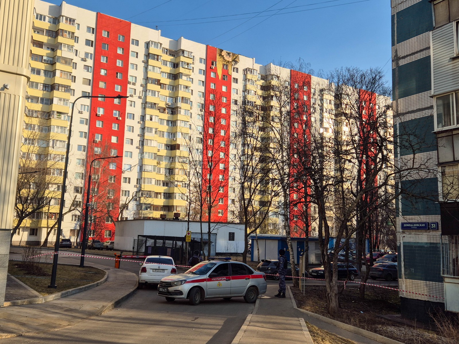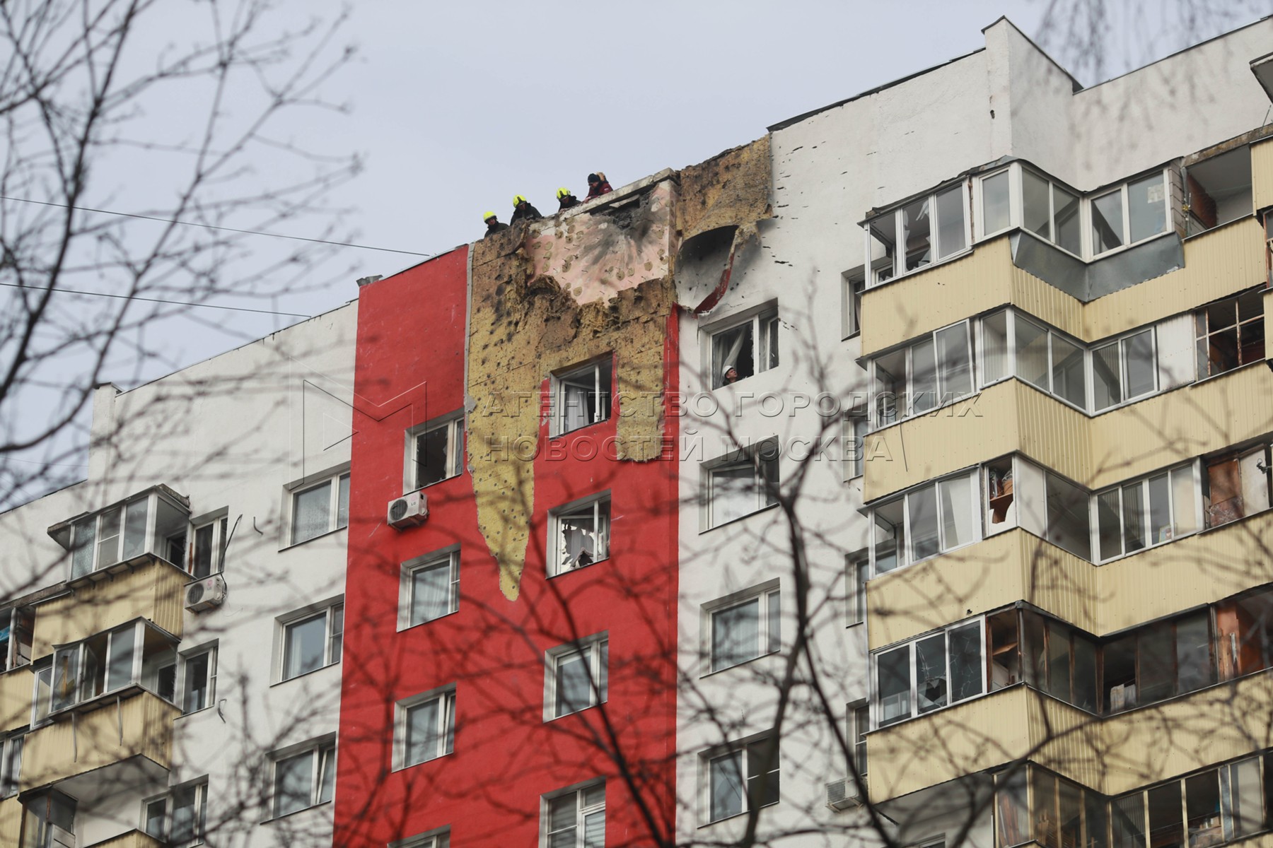 • Заголовок: Оперативные службы у дома на Домодедовской улице, где обломки БПЛА повредили жилой дом