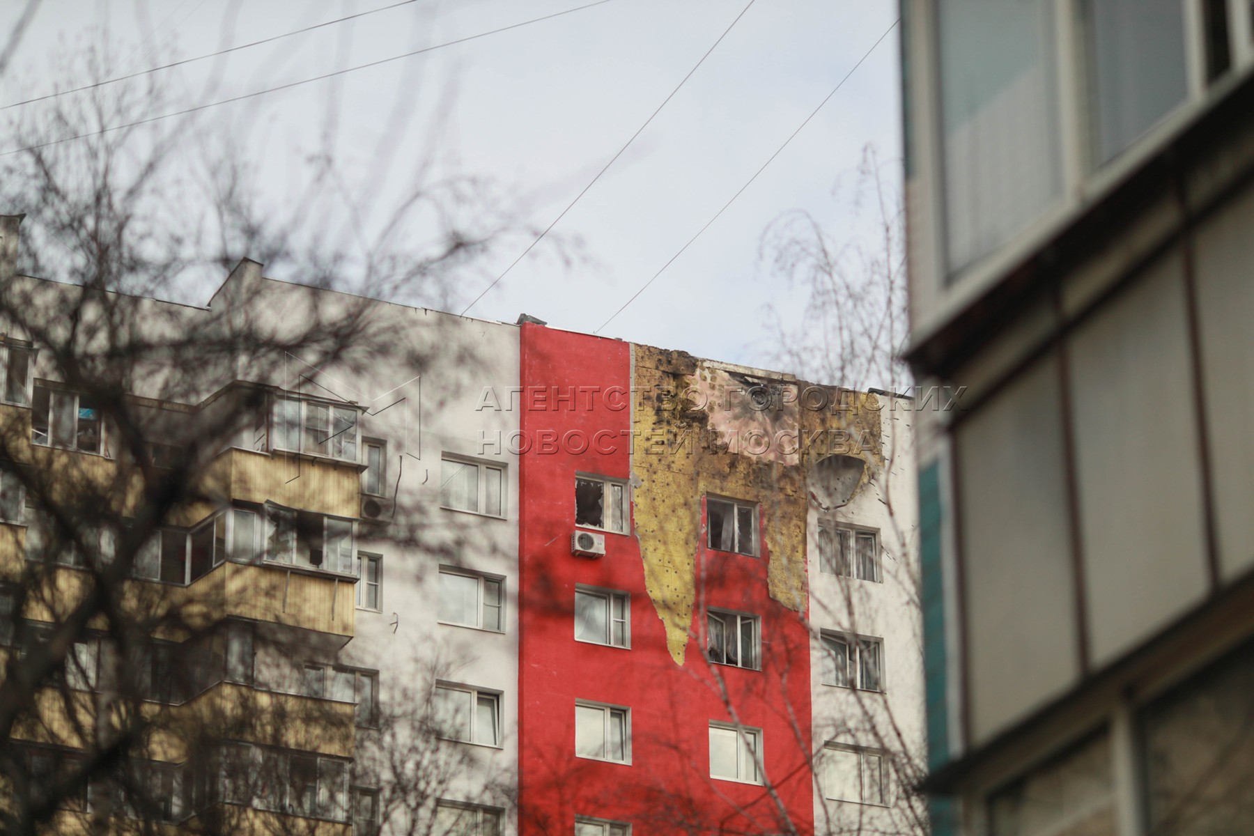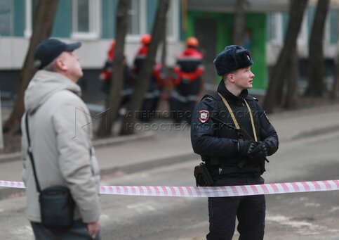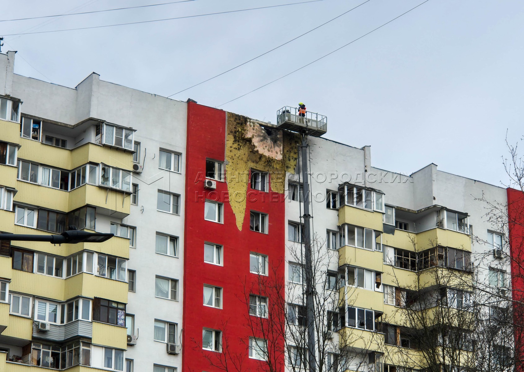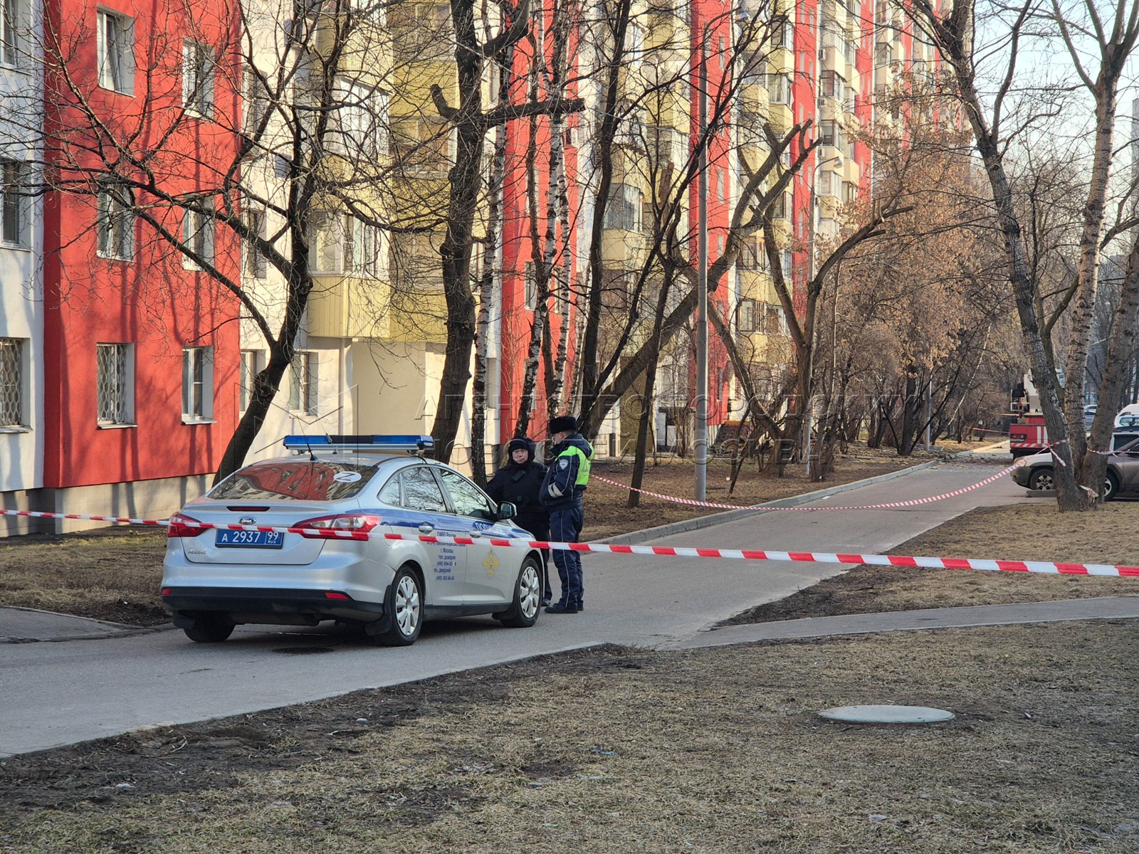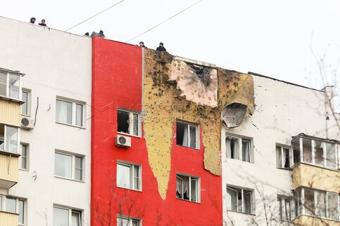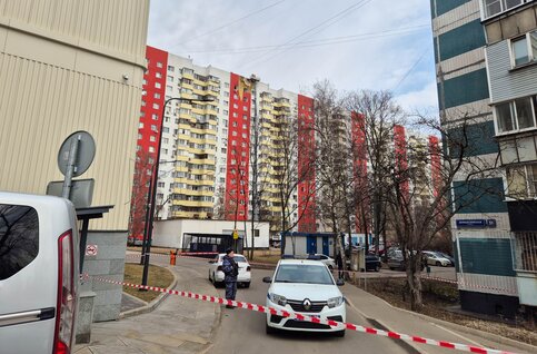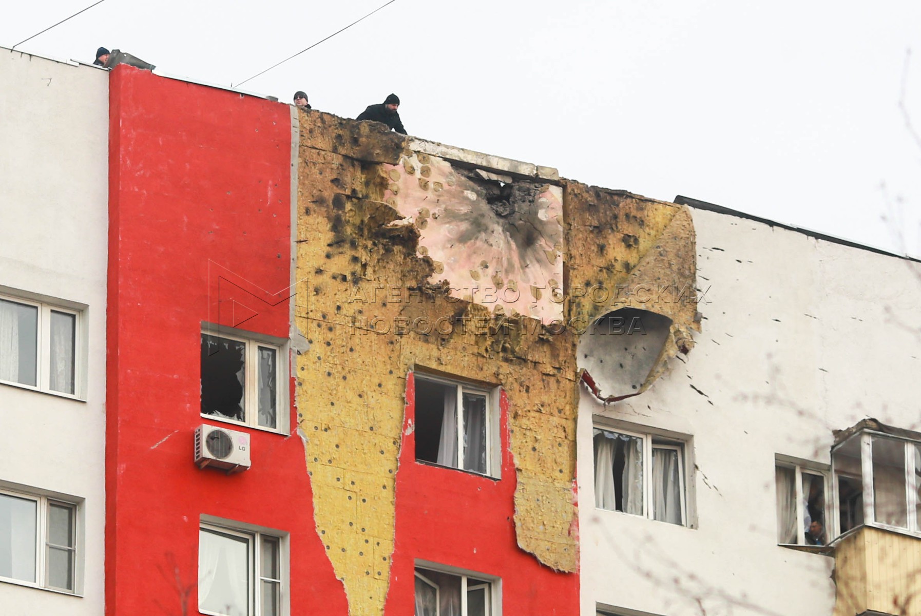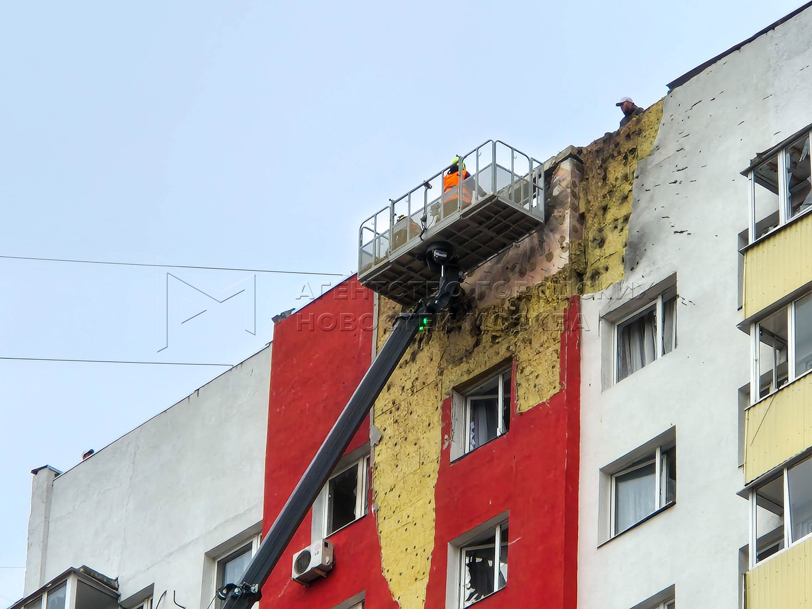 • Заголовок: Оперативные службы у дома на Домодедовской улице, где обломки БПЛА повредили жилой дом