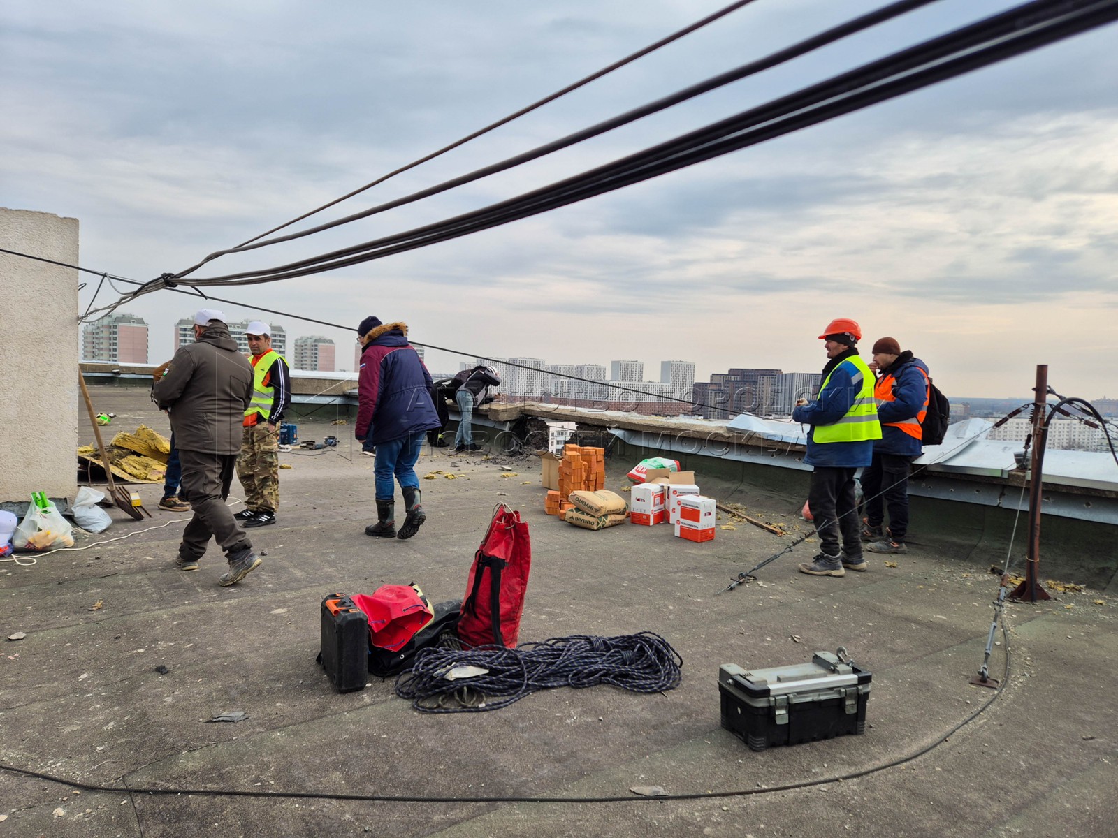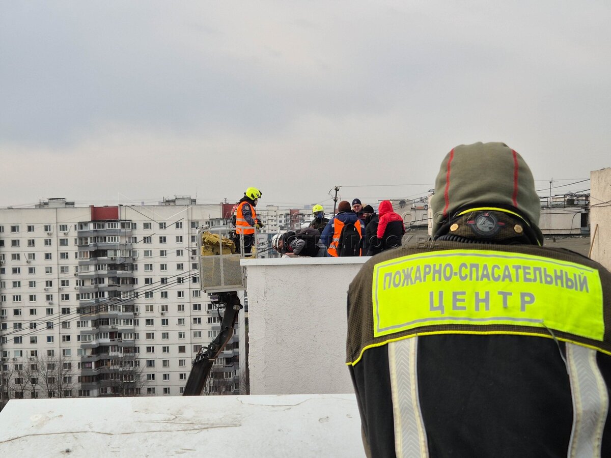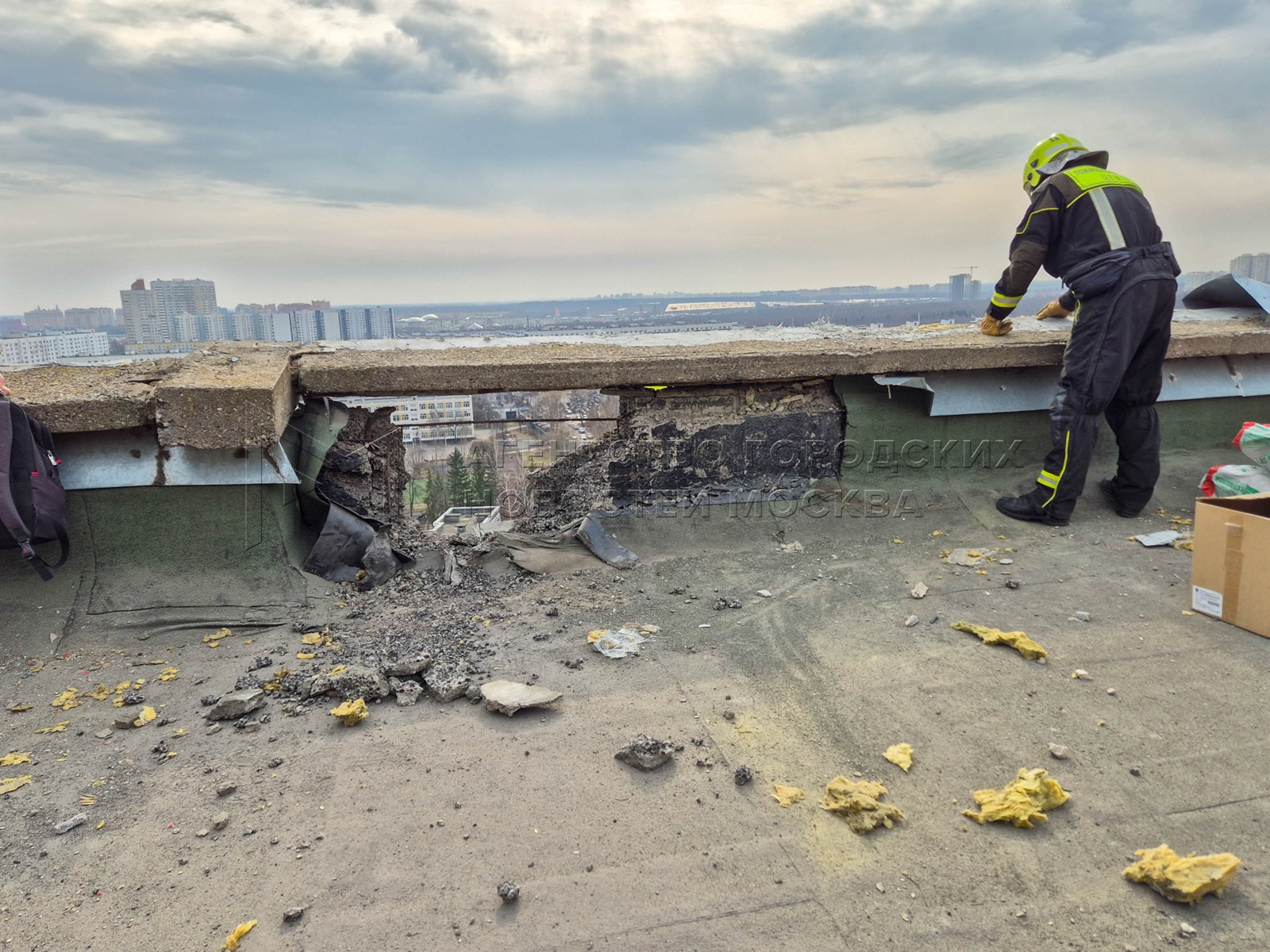 Оперативные службы на крыше дома 27 на ул. Домодедовская, где обломки БПЛА повред...