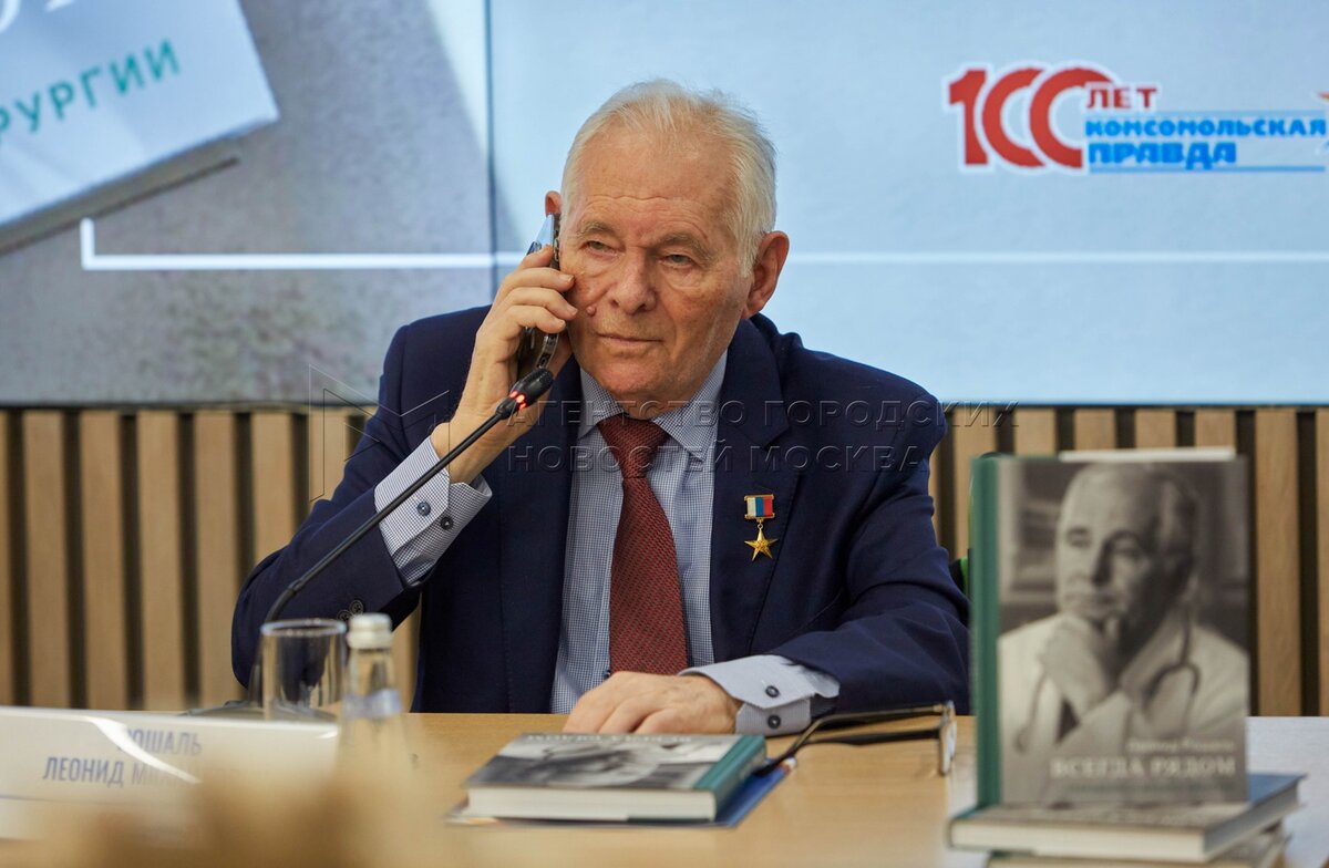 Врач-педиатр, хирург и общественный деятель Леонид Рошаль во время презентации своей книги «Всегда рядом!» в пресс-центре медиагруппы «Комсомольская правда».