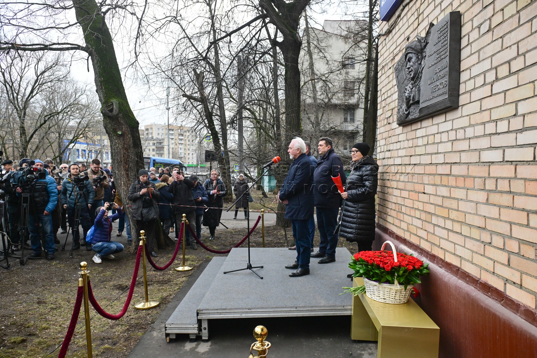 Главный редактор газеты «Московский комсомолец» Павел Гусев (третий справа) и председатель Союза журналистов России Владимир Соловьев (второй справа). Торжественное открытие мемориальной доски на доме, в котором 50 лет прожил обозреватель «Комсомольской правды», ведущий программы «В мире животных», выдающийся советский и российский журналист, писатель, путешественник, общественный деятель Василий Песков.
