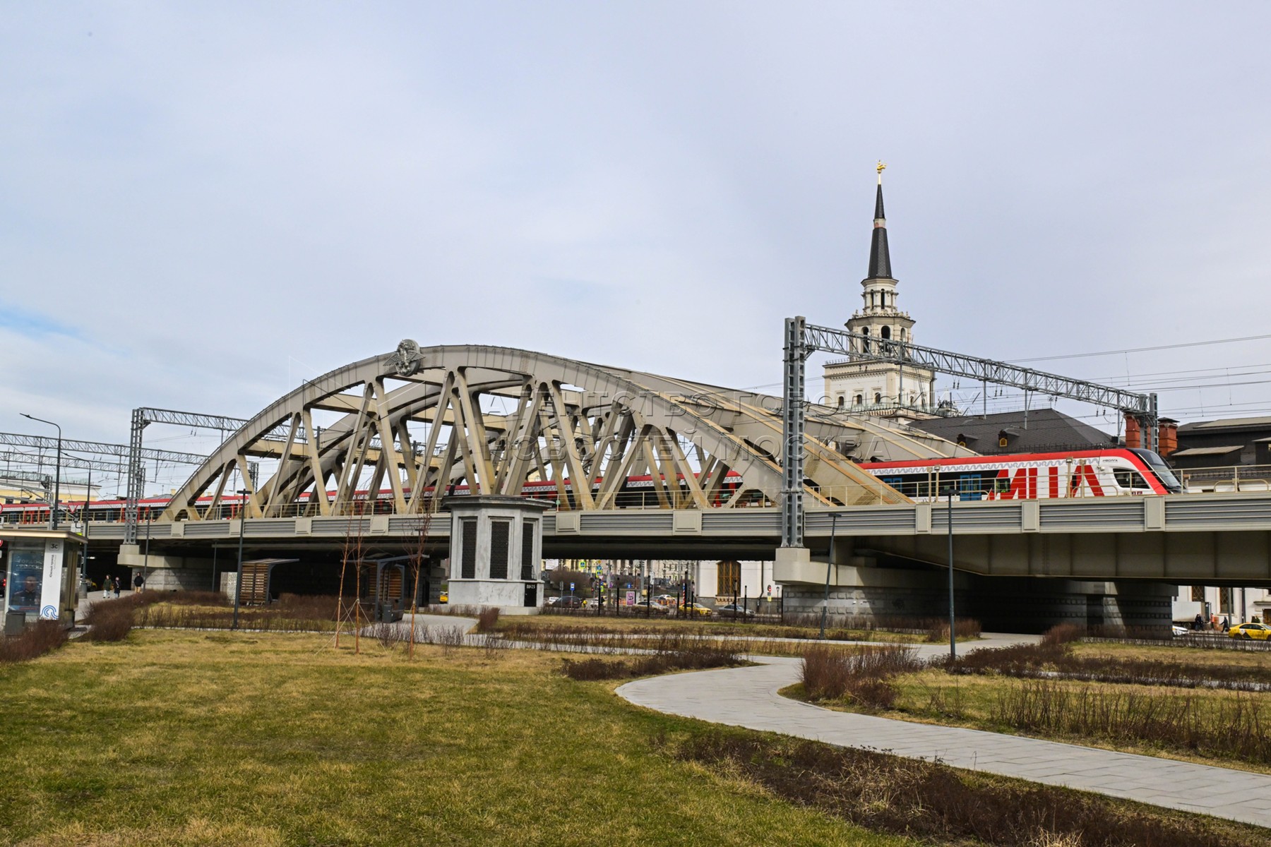 • Описание: Мост Каланчевского путепровода и поезд Московских центральных диаметров (МЦД) на Комсомольской площади в Москве.