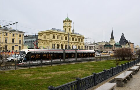 Трамвай у Ленинградского вокзала на Комсомольской площади в Москве.