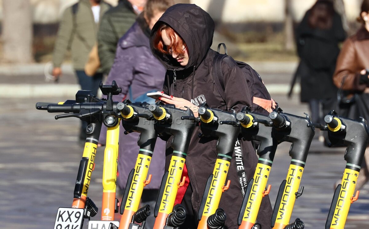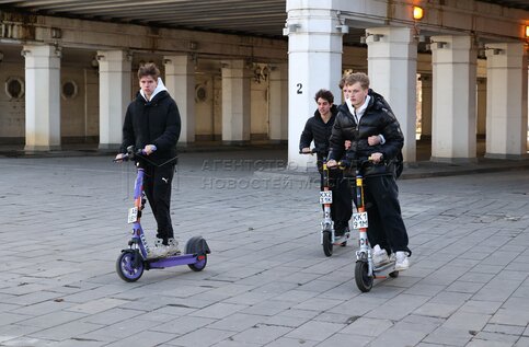 Мальчики на самокатах в парке Ходынское поле.