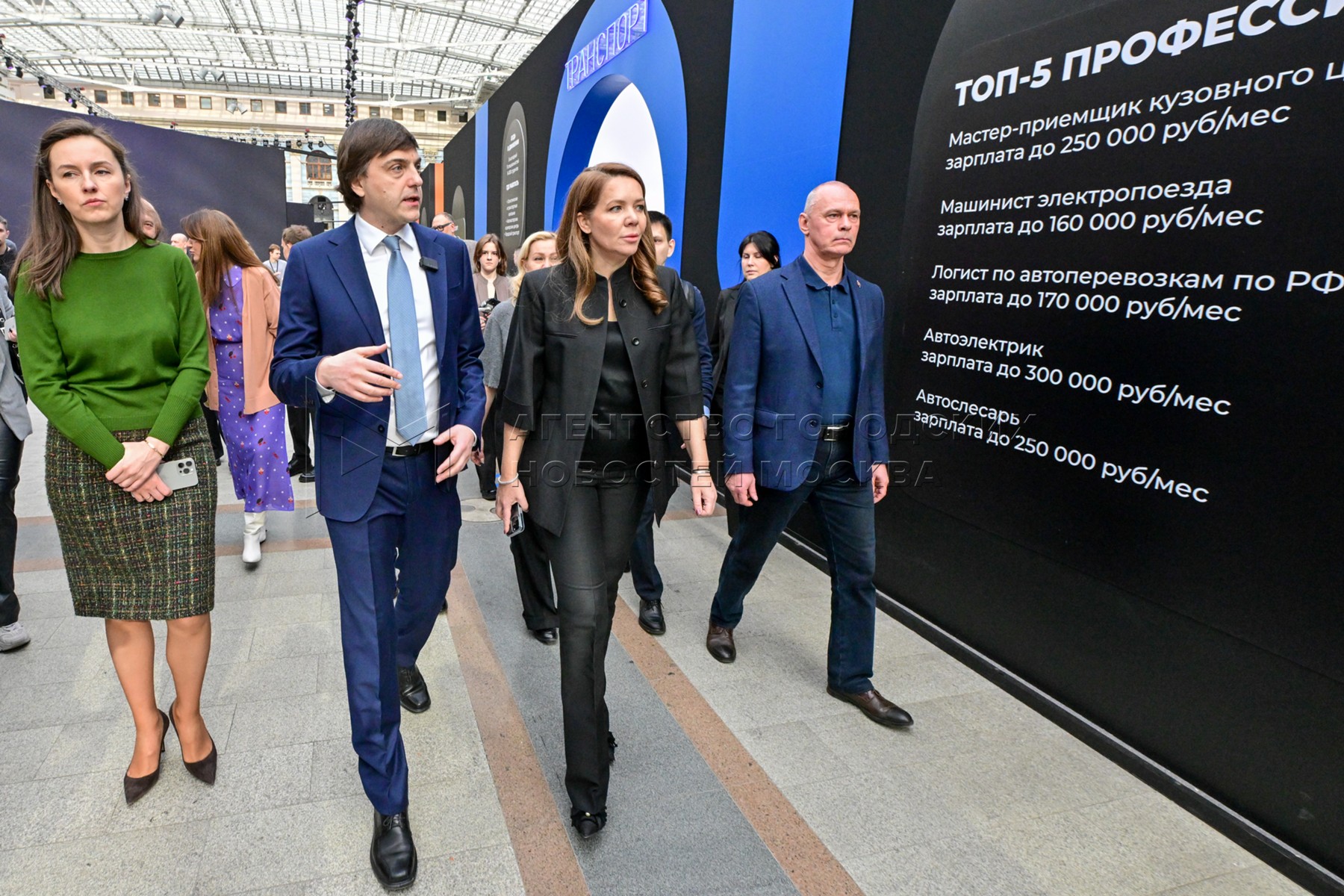 Министр просвещения РФ Сергей Кравцов и заместитель мэра Москвы в правительстве Москвы по вопросам социального развития Анастасия Ракова. Последний день работы форума колледжей Москвы в Гостином дворе.