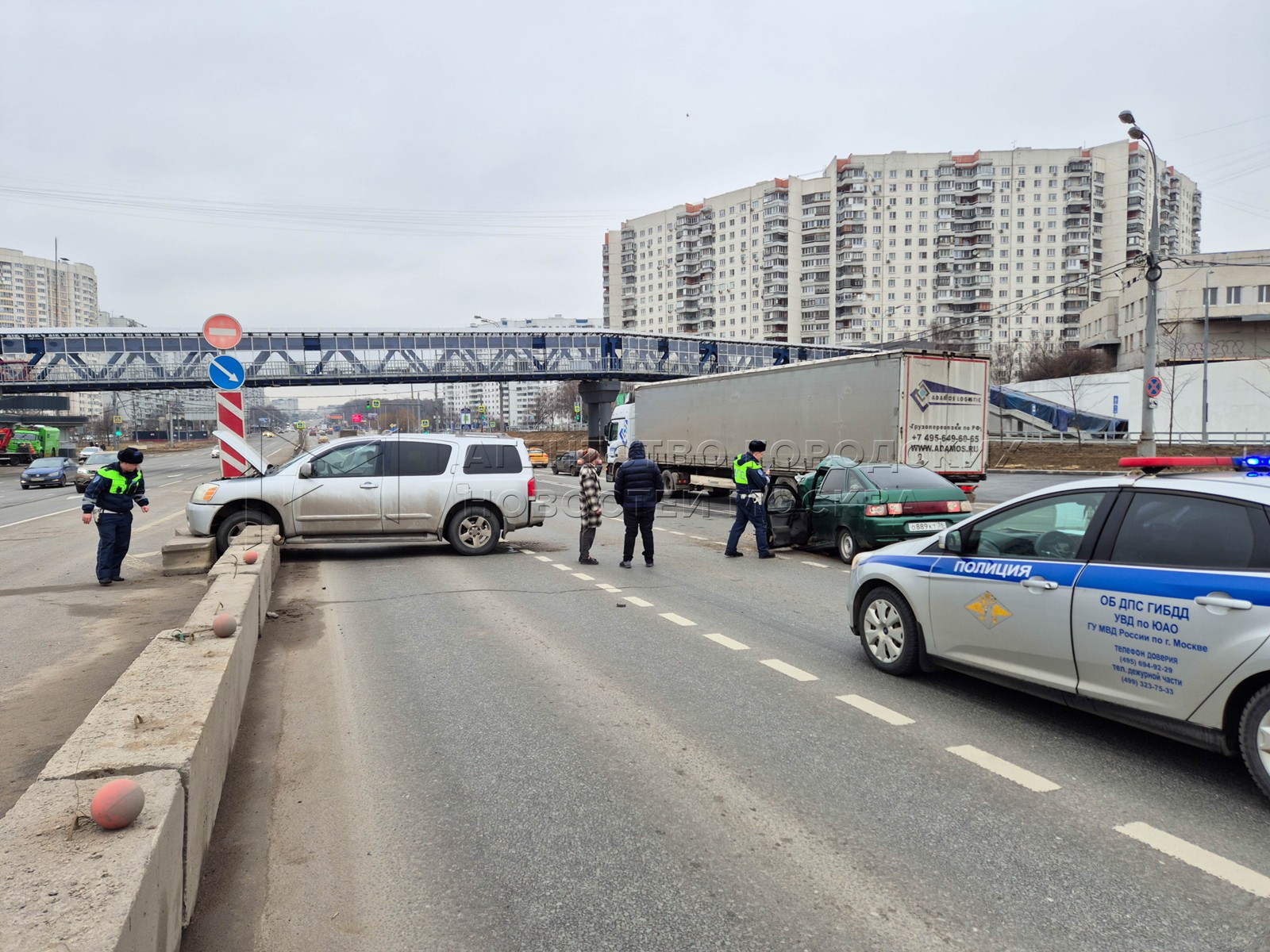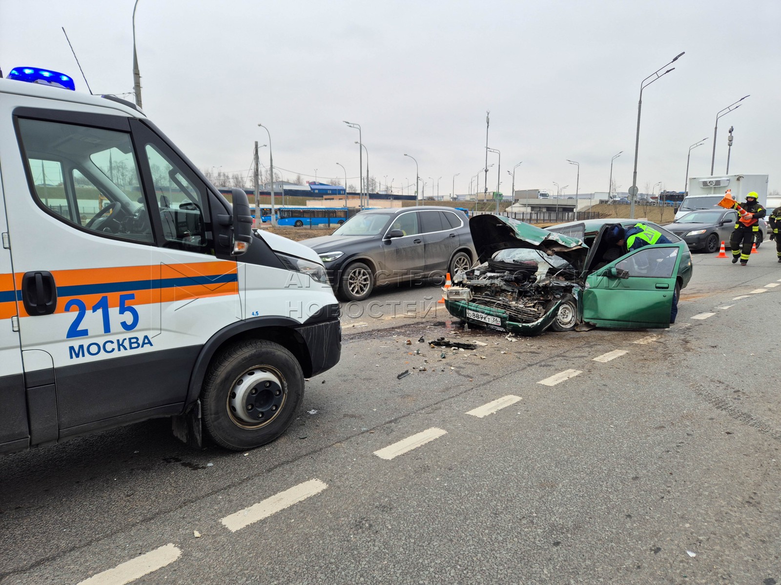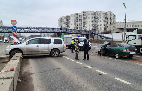 • Описание: Последствия столкновения легкового автомобиля ВАЗ-2112 с внедорожником Nissan на ул. Липецкая на юге Москвы.