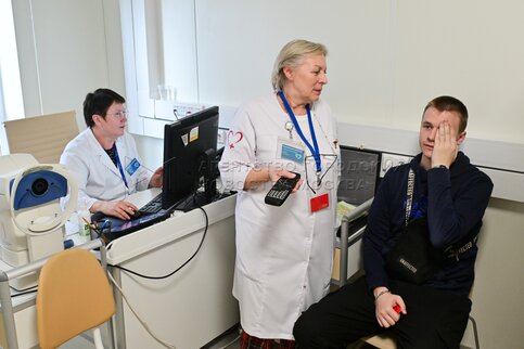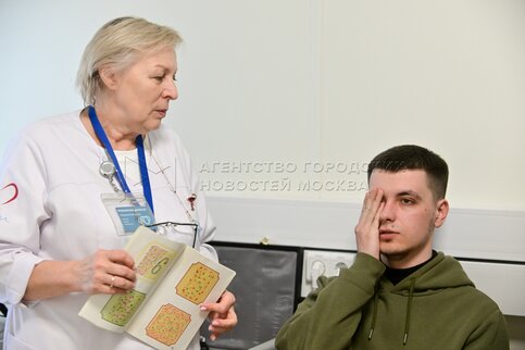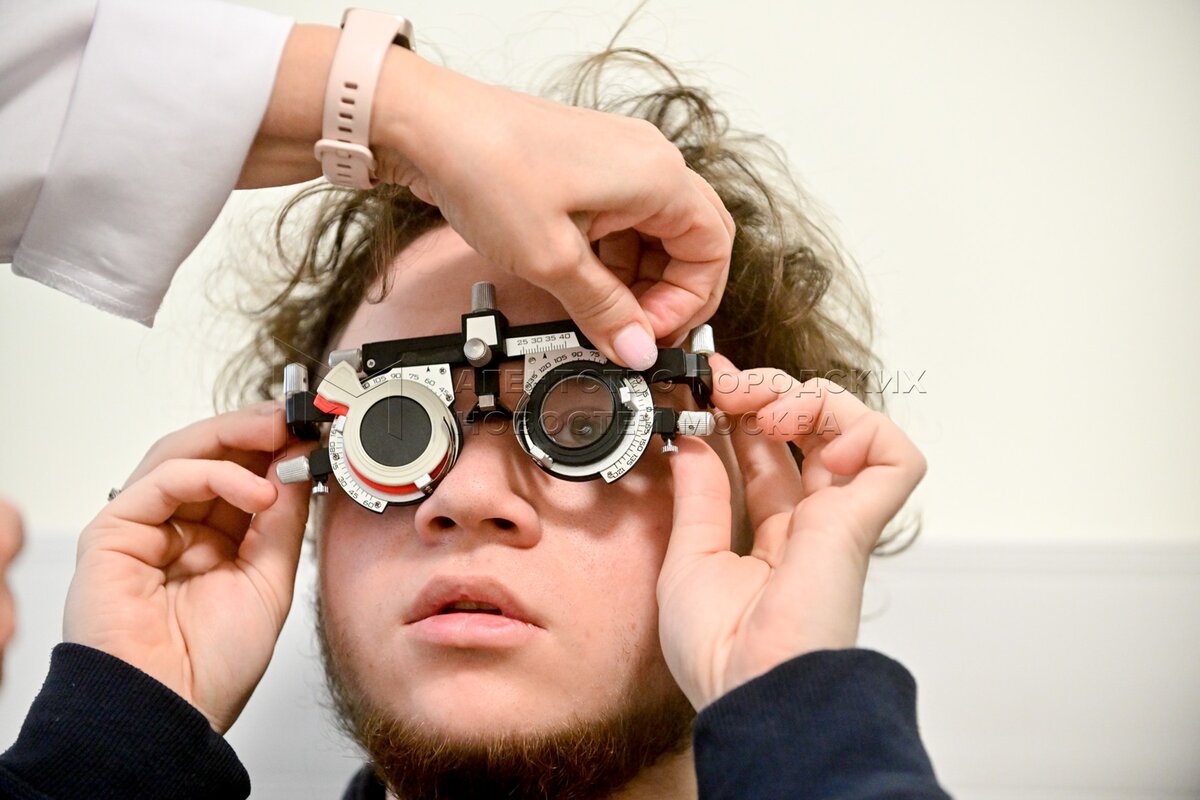 Призывник во время проверки зрения. Весенний призыв на срочную военную службу нач...