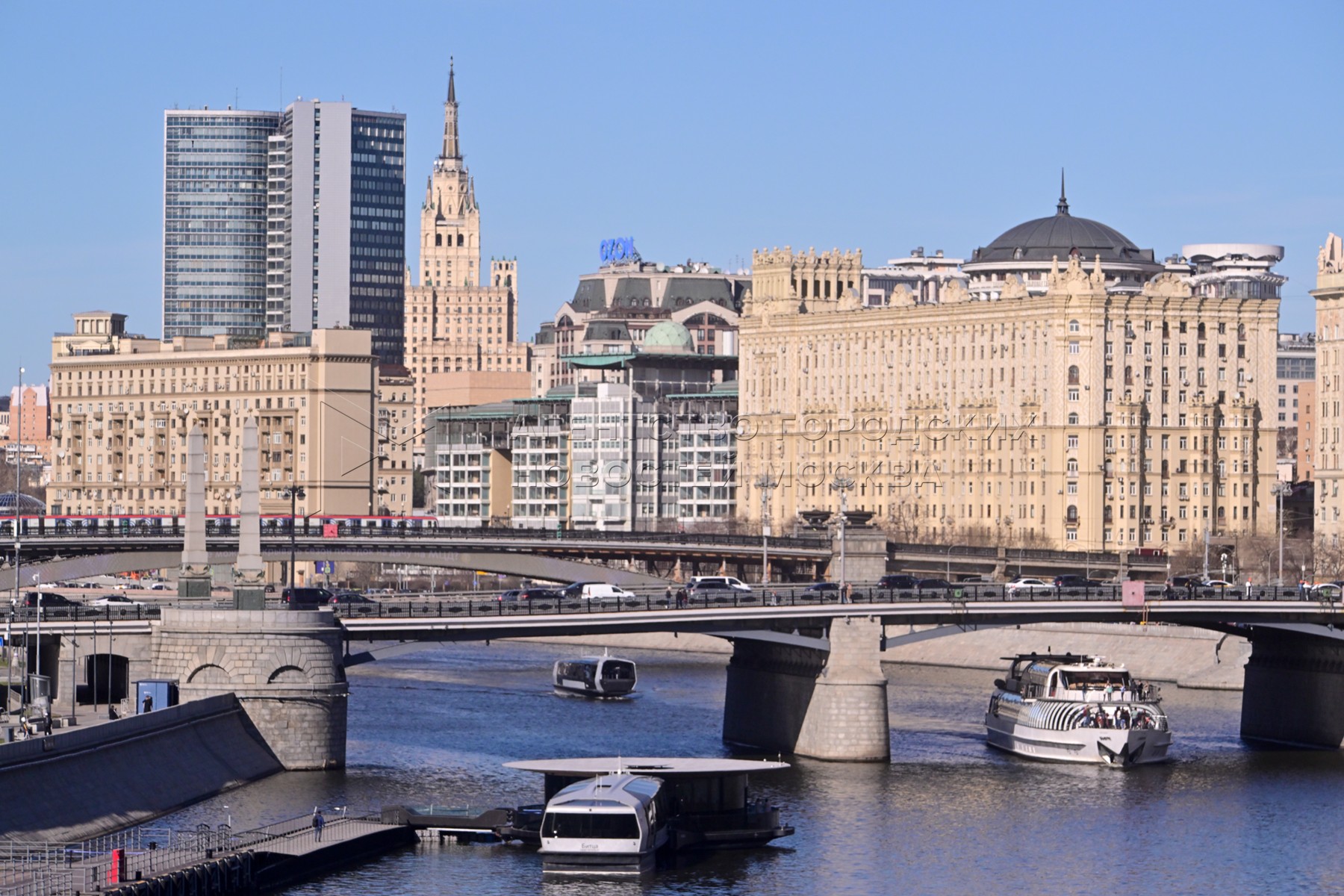 Весенние городские виды 2 апреля 2025 года. Трамвай на фоне высотного здания на Котельнической набережной.