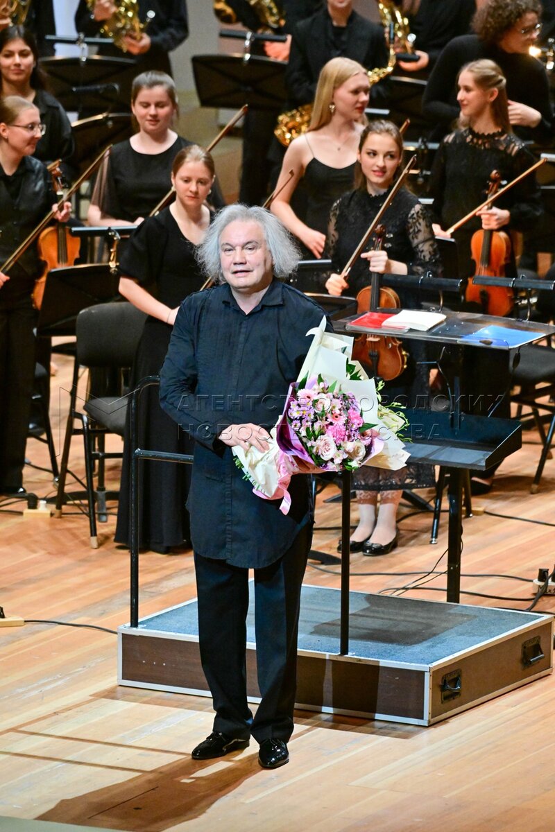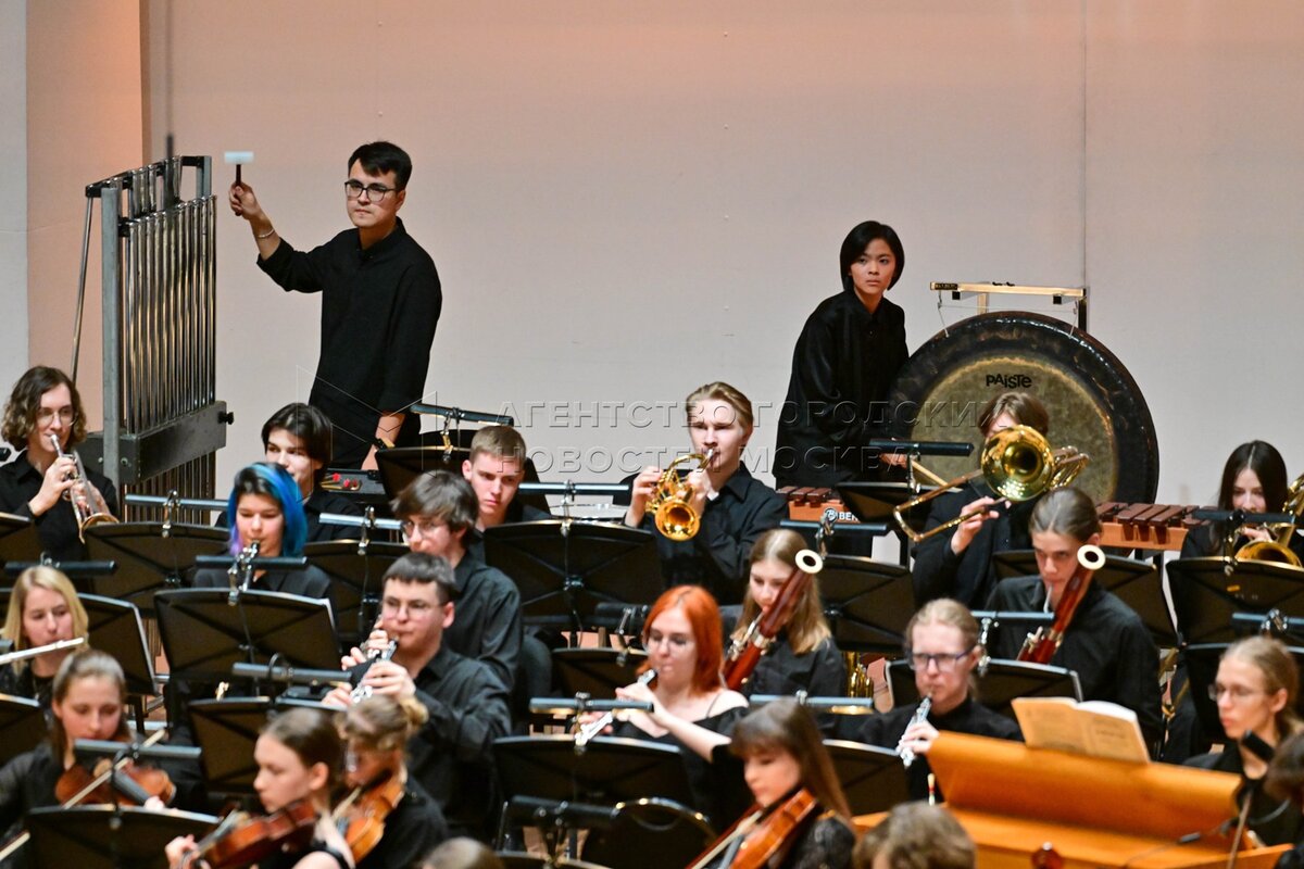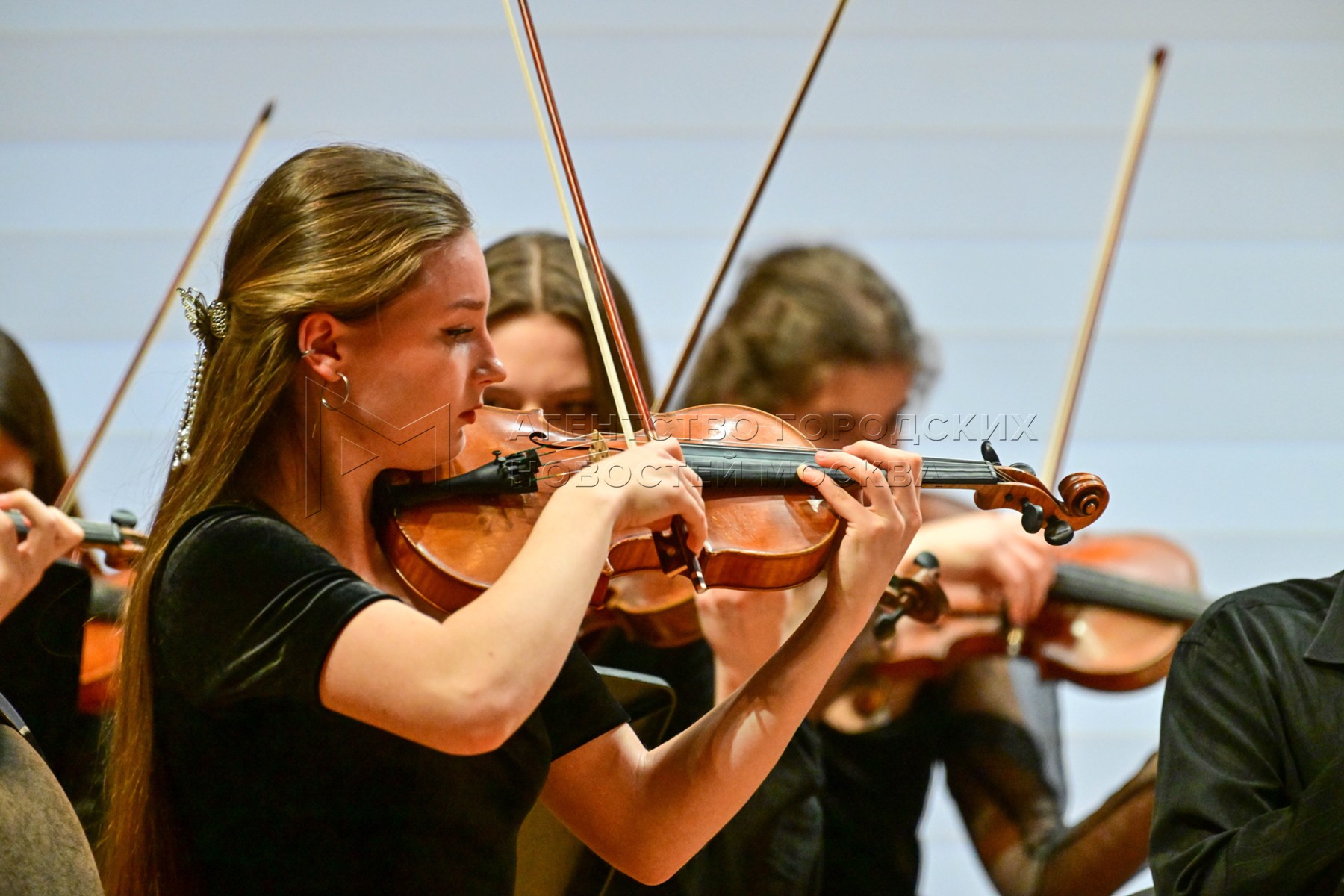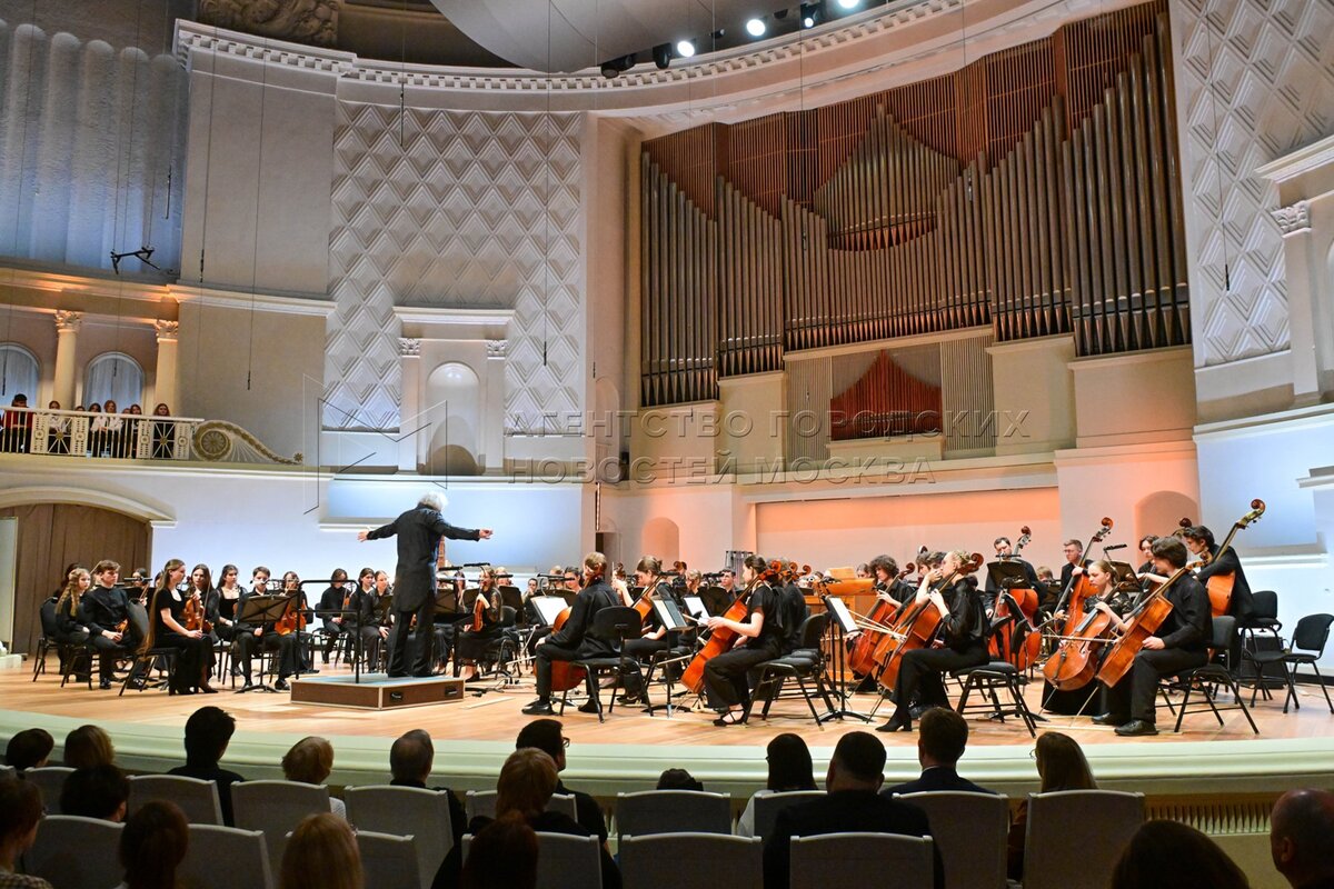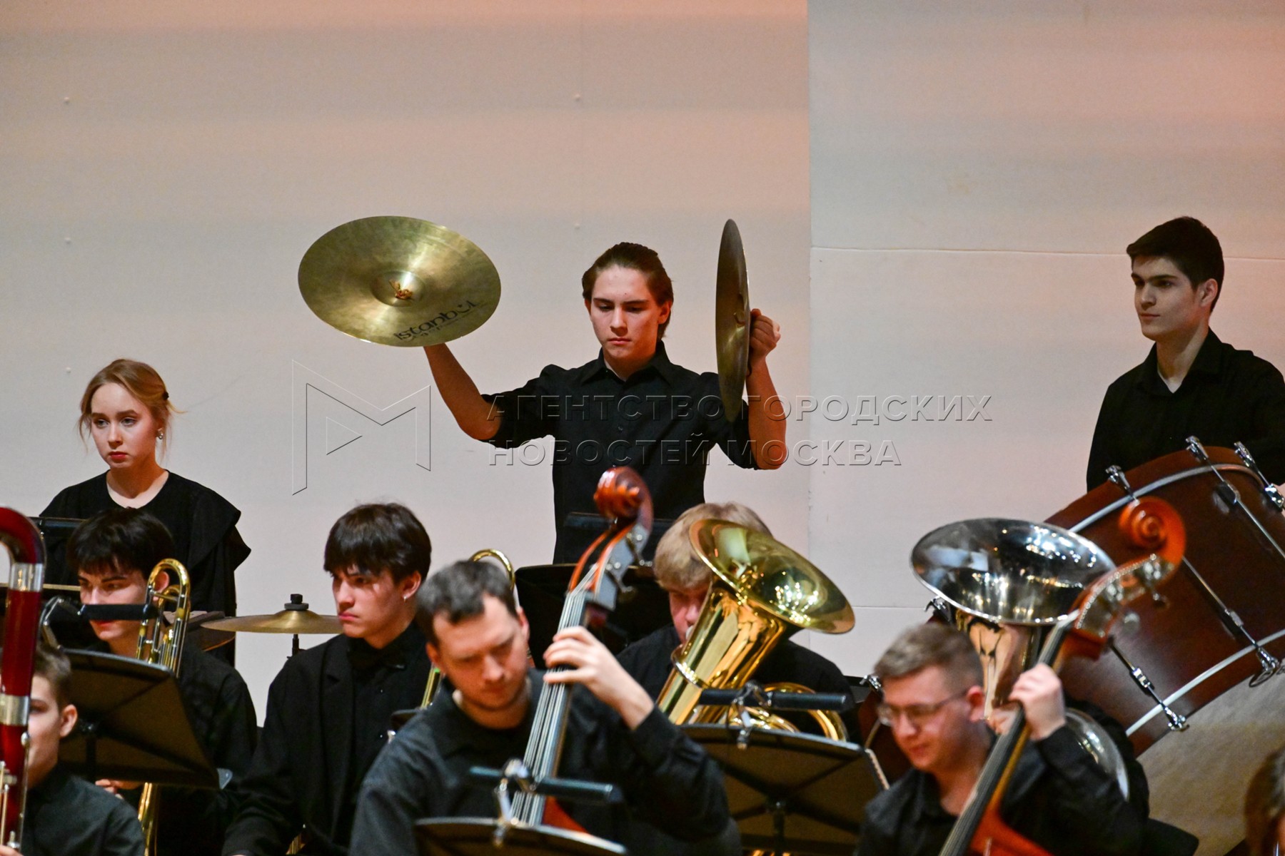 • Описание: Художественный руководитель оркестра «Гнесинские виртуозы», дирижер Михаил Хохлов и оркестр «Гнесинские виртуозы» во время выступления с новой концертной программой, посвященной 80-летию Победы в Великой Отечественной войне, в концертном зале имени Чайковского.