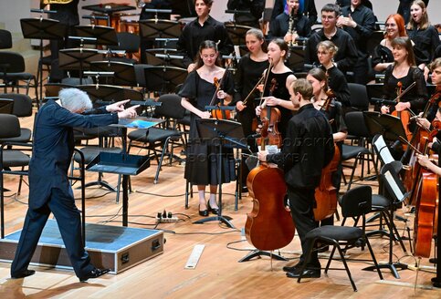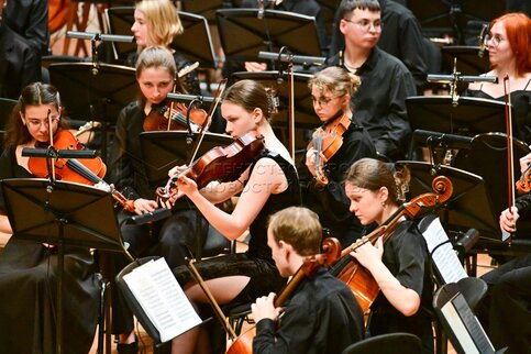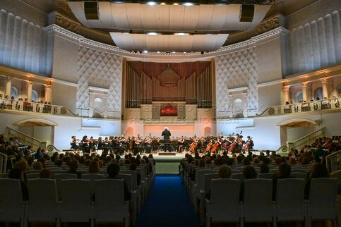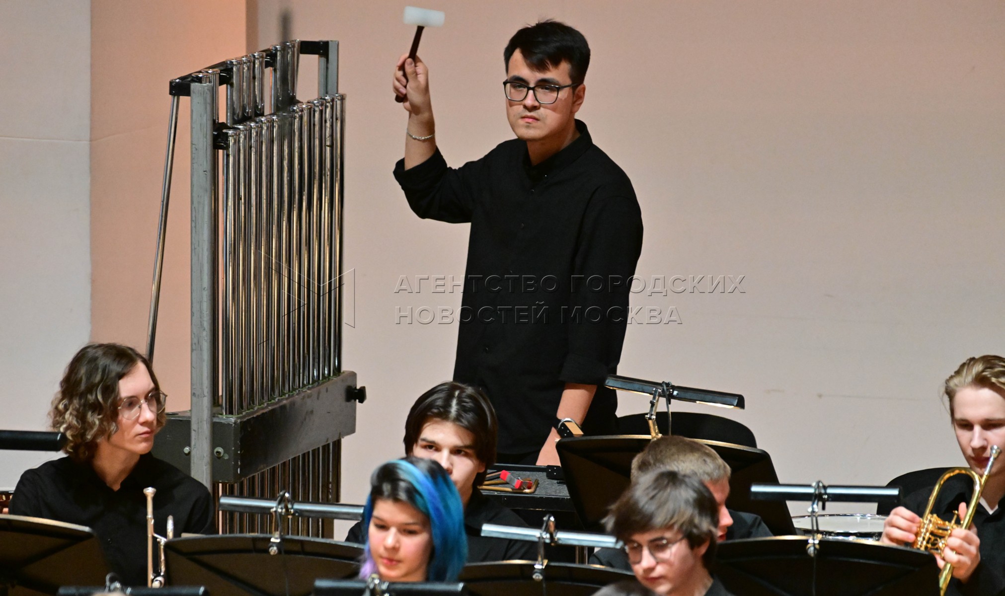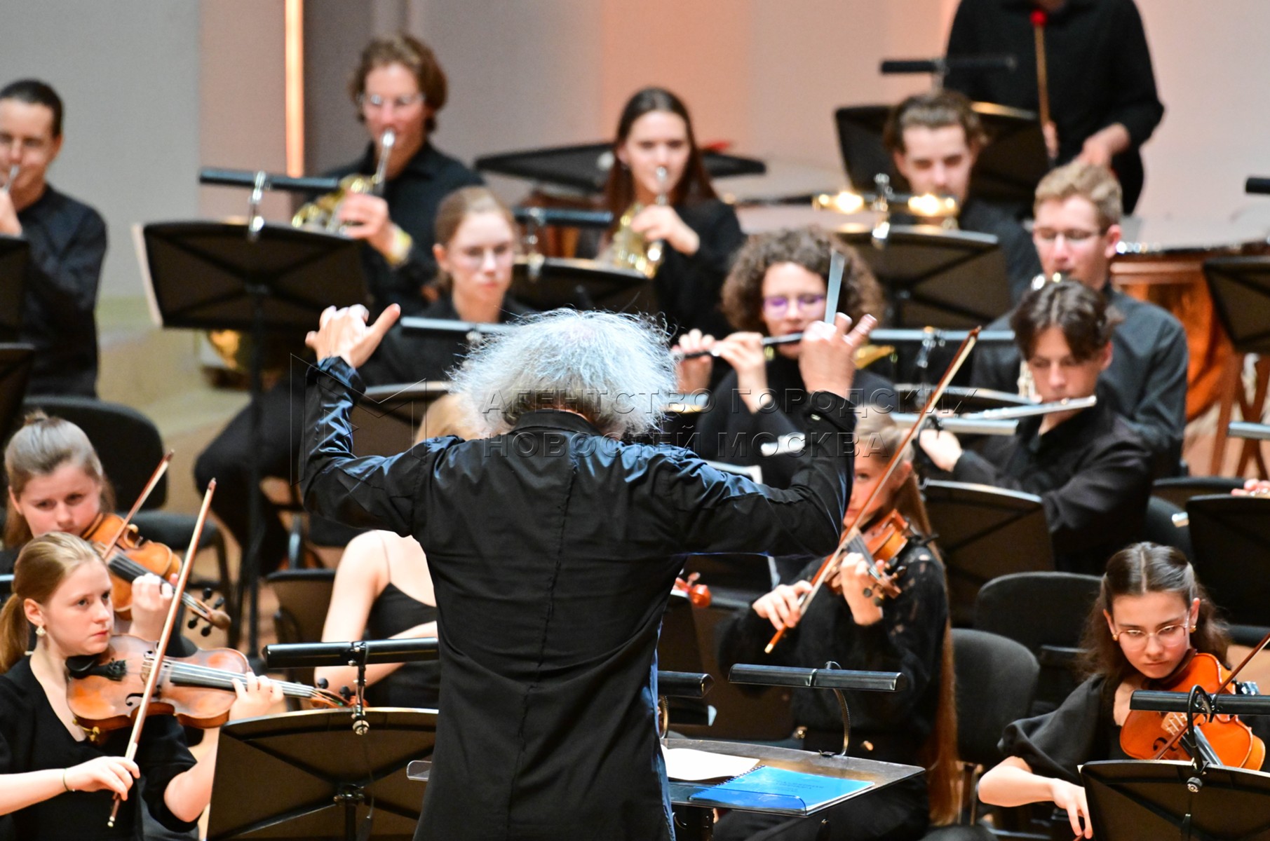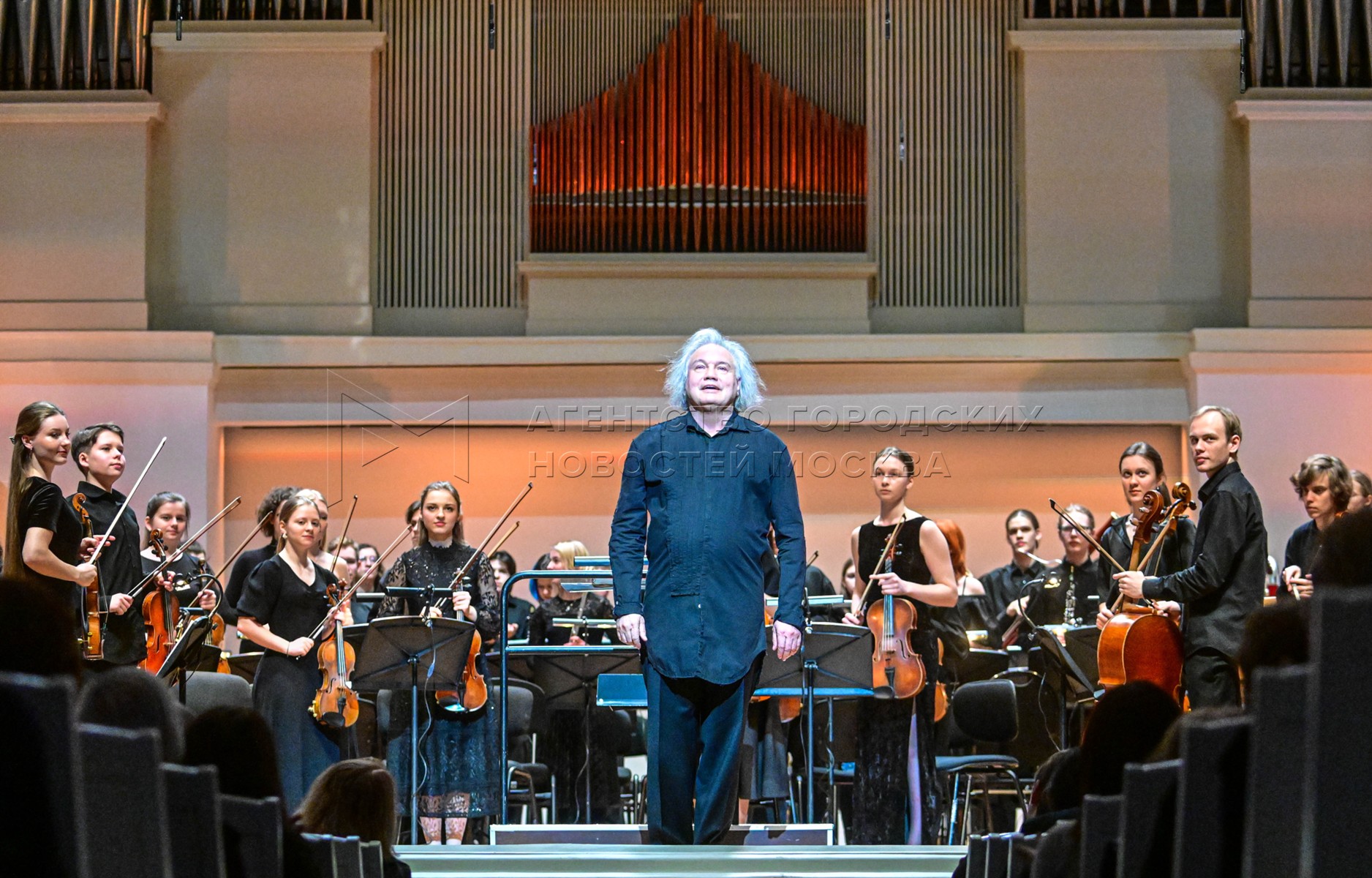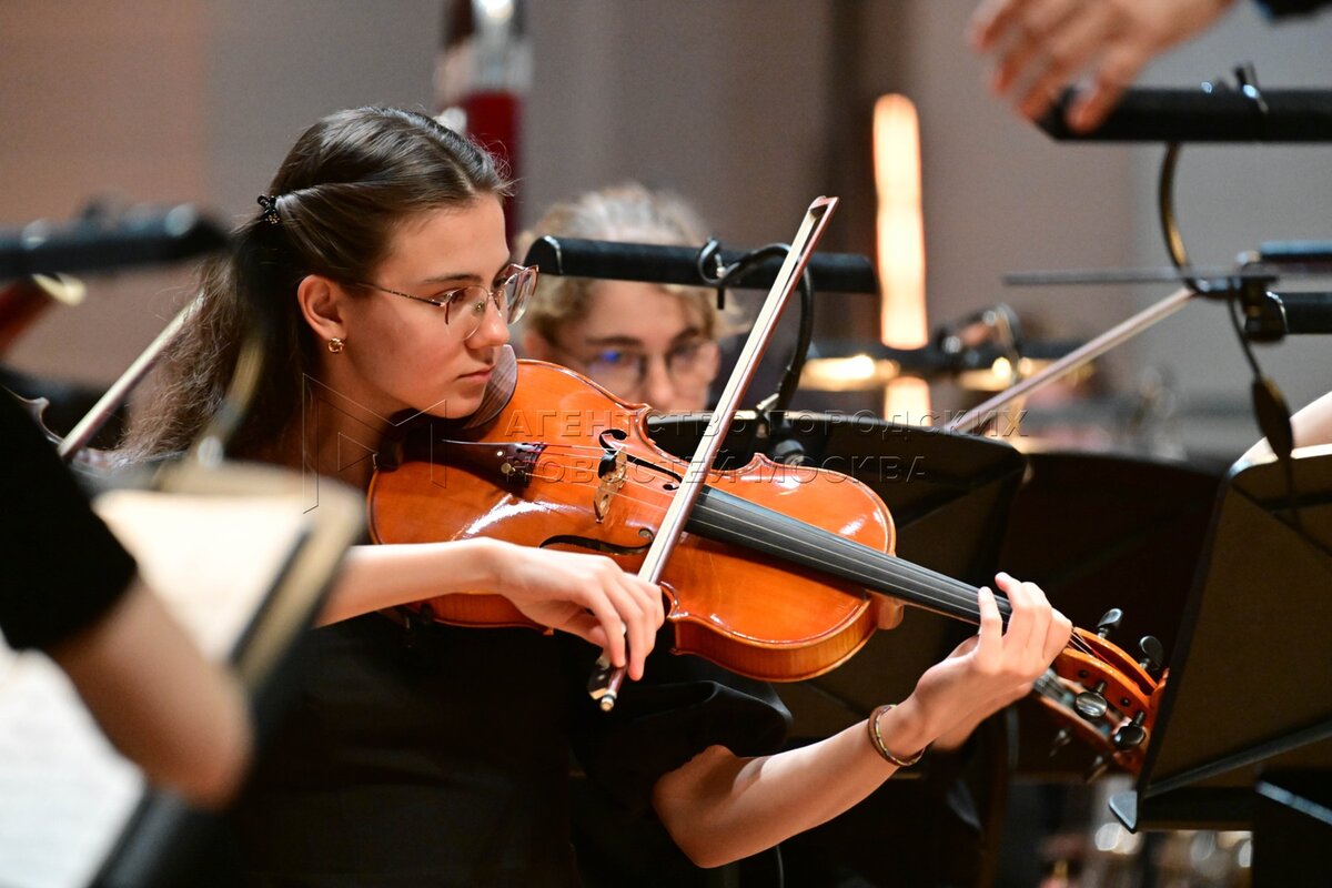 • Описание: Художественный руководитель оркестра «Гнесинские виртуозы», дирижер Михаил Хохлов и оркестр «Гнесинские виртуозы» во время выступления с новой концертной программой, посвященной 80-летию Победы в Великой Отечественной войне, в концертном зале имени Чайковского.