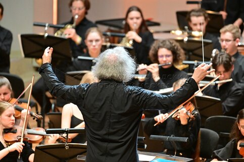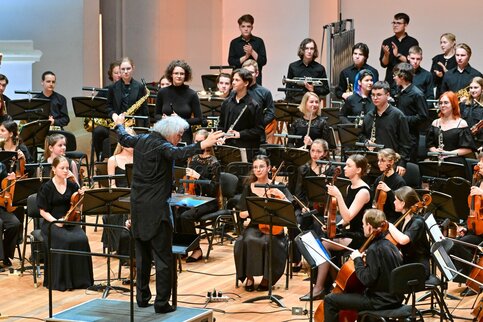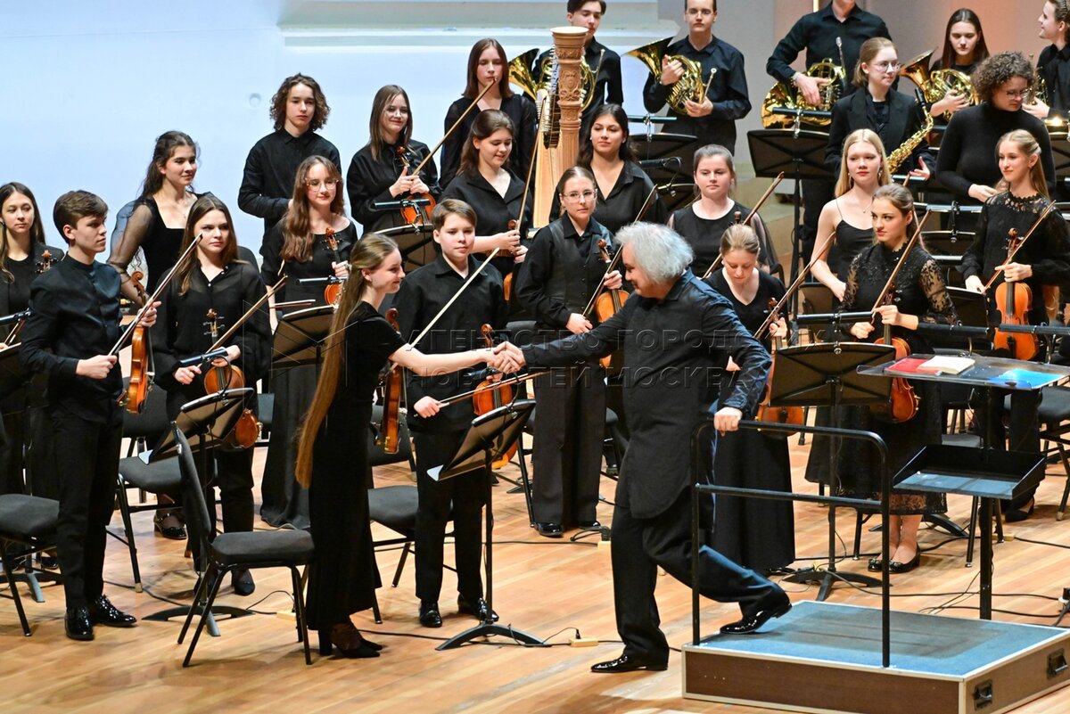 Художественный руководитель оркестра «Гнесинские виртуозы», дирижер Михаил Хохлов и оркестр «Гнесинские виртуозы» во время выступления с новой концертной программой, посвященной 80-летию Победы в Великой Отечественной войне, в концертном зале имени Чайковского.