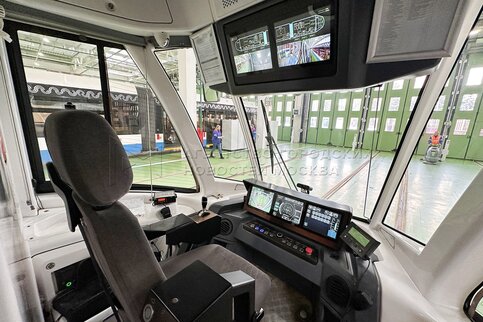 Кабина трамвая в открытом после реконструкции старейшем в городе трамвайном депо ...