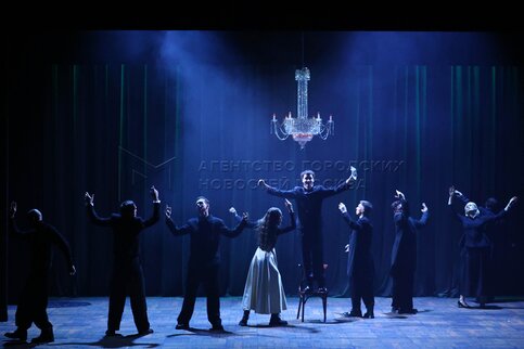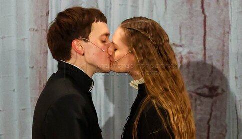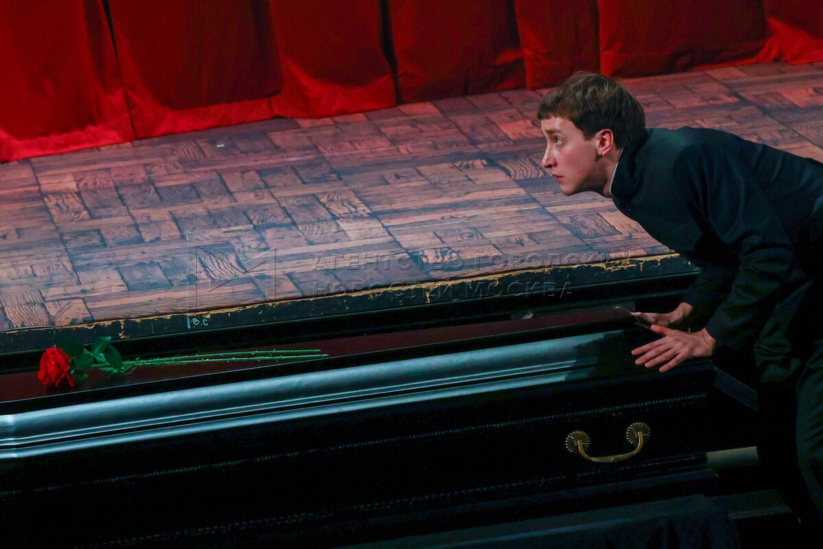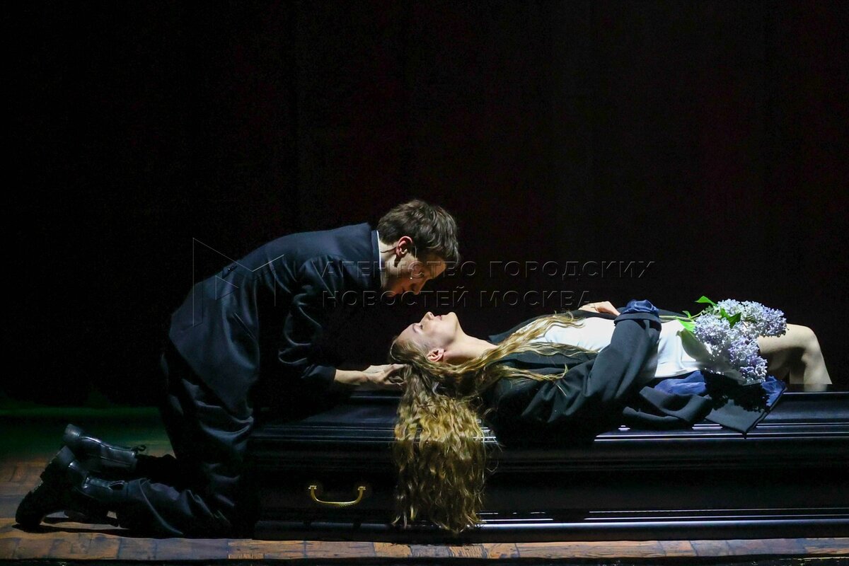 Актеры Сергей Кирпиченок в роли Гамлета и Ксения Галибина в роли Офелии. Показ сп...
