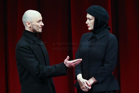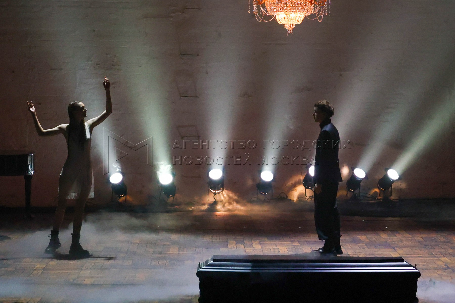 Актеры Мария Матвеева в роли Гертруды и Сергей Кирпиченок в роли Гамлета. Показ спектакля «Гамлет» режиссера Мурата Абулкатинова по пьесе Ники Ратмановой по мотивам произведения Уильяма Шекспира на основной сцене Театра на Таганке перед премьерой.
