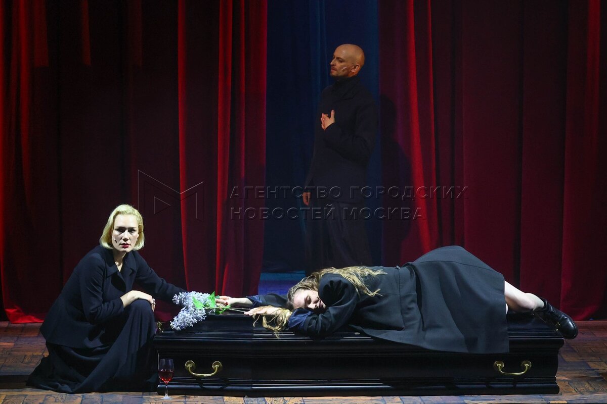 Актеры Никита Лучихин, Сергей Кирпиченок в роли Гамлета и Иван Коряковский (слева...