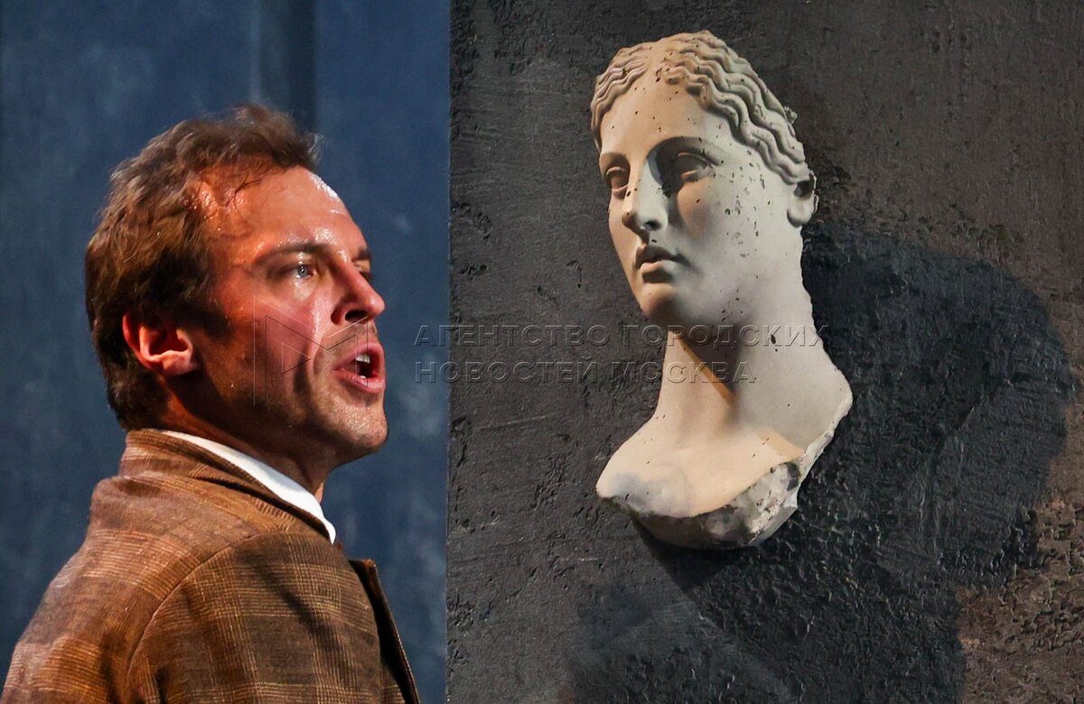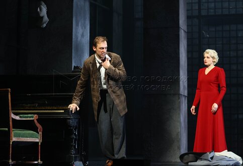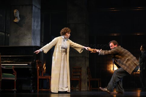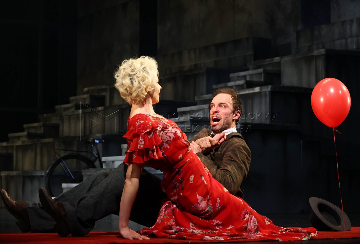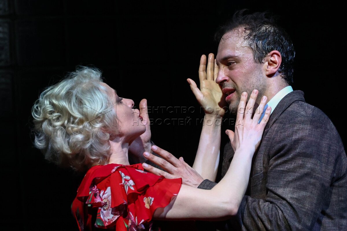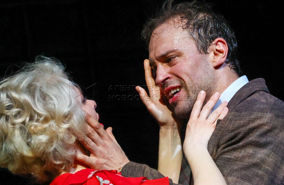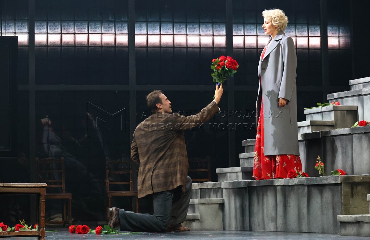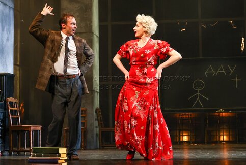 Павел Попов (Лев Ландау) и Юлия Рутберг (Любовь Ландау). Пресс-показ спектакля «Солнце Ландау», в рамках Открытого фестиваля искусств «Черешневый лес», на основной сцене Государственного академического театра имени Вахтангова. Режиссер постановки – Анатолий Шульев.