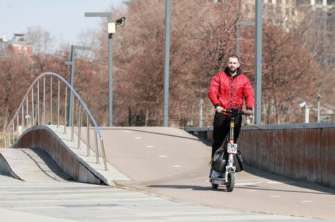 Горожанин на электросамокате. Городские жанры и виды Москвы 14 апреля 2025 года.