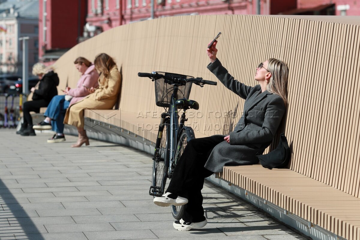 Люди во время отдыха на скамейке. Городские жанры и виды Москвы 14 апреля 2025 го...