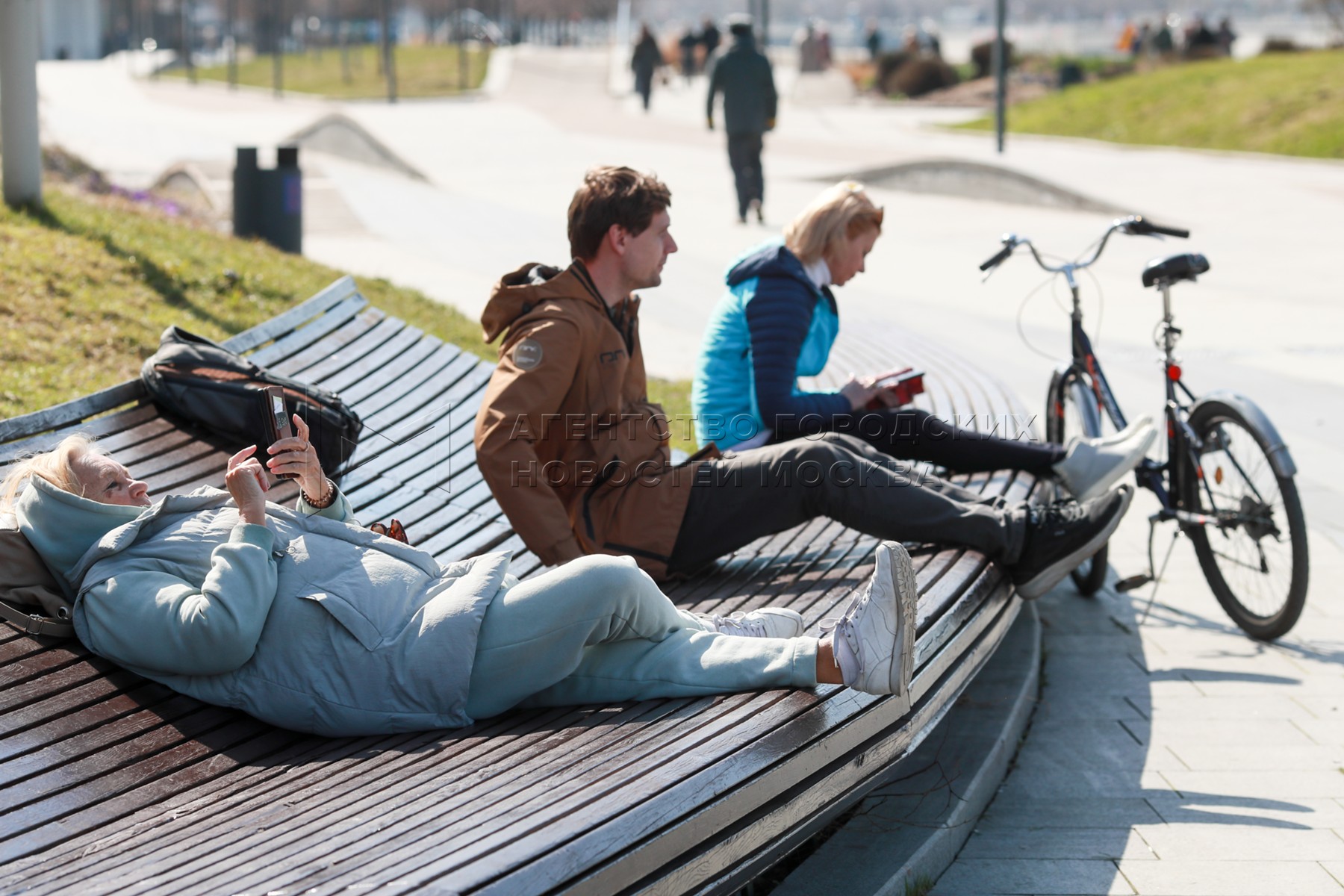 Люди во время отдыха на скамейке. Городские жанры и виды Москвы 14 апреля 2025 го...