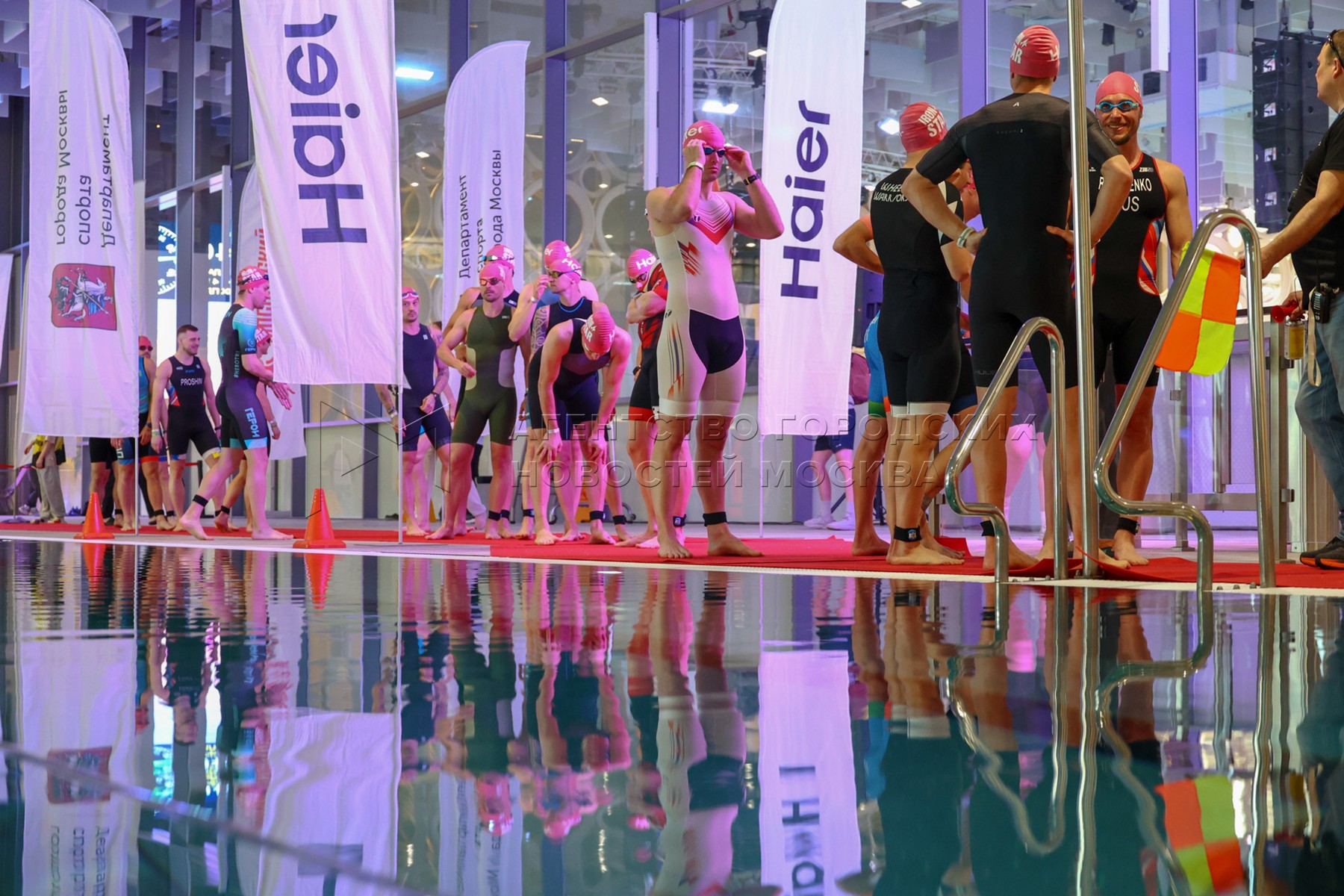 Спортсмены во время этапов соревнований «Лига триатлона & Ironstar 1/8» в Лужника...