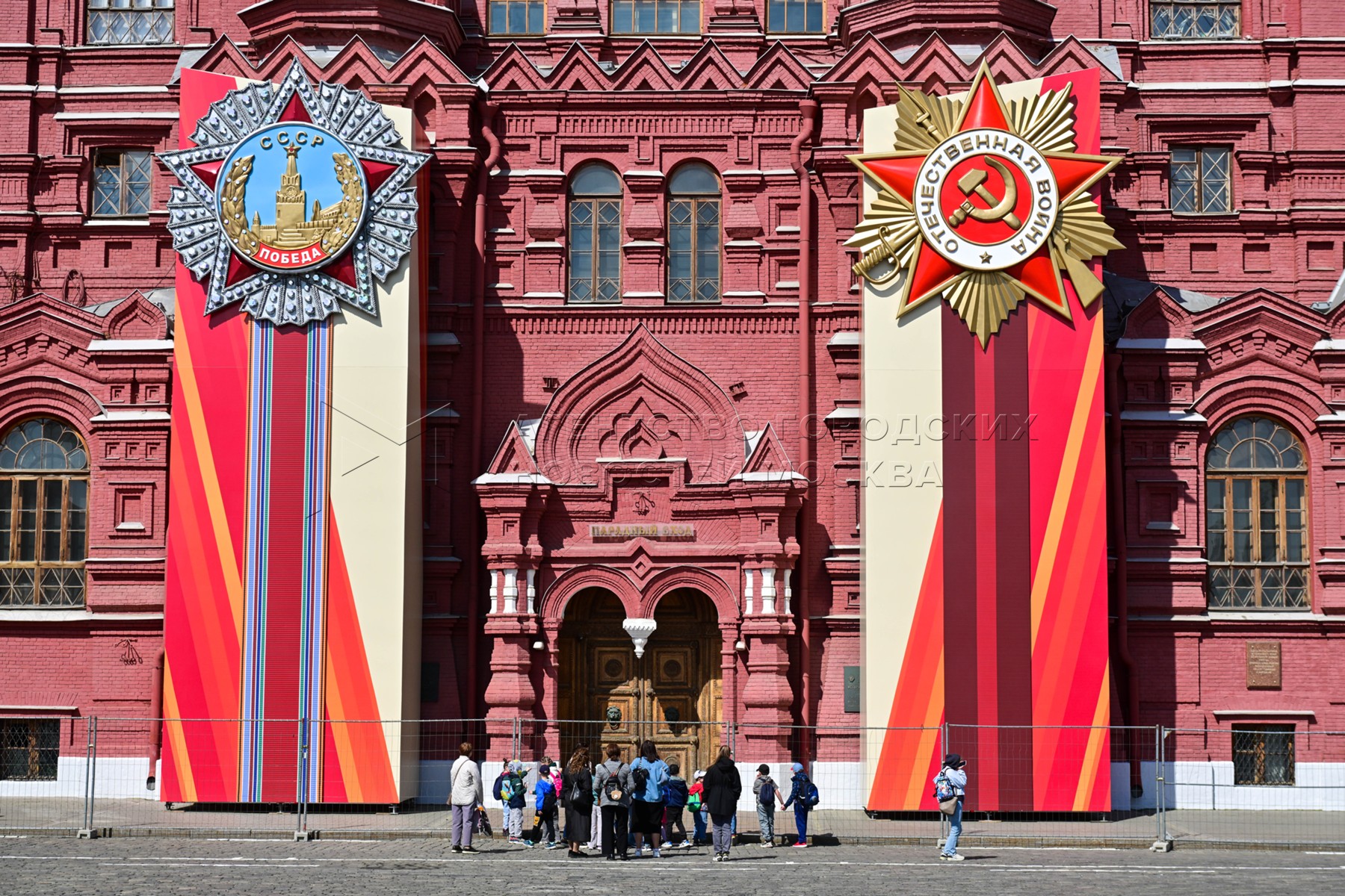 • Описание: Украшение ко Дню Победы на здании Государственного исторического музея (ГИМ). Оформление Москвы ко Дню Победы.