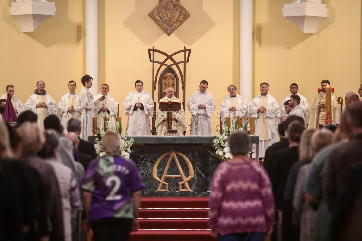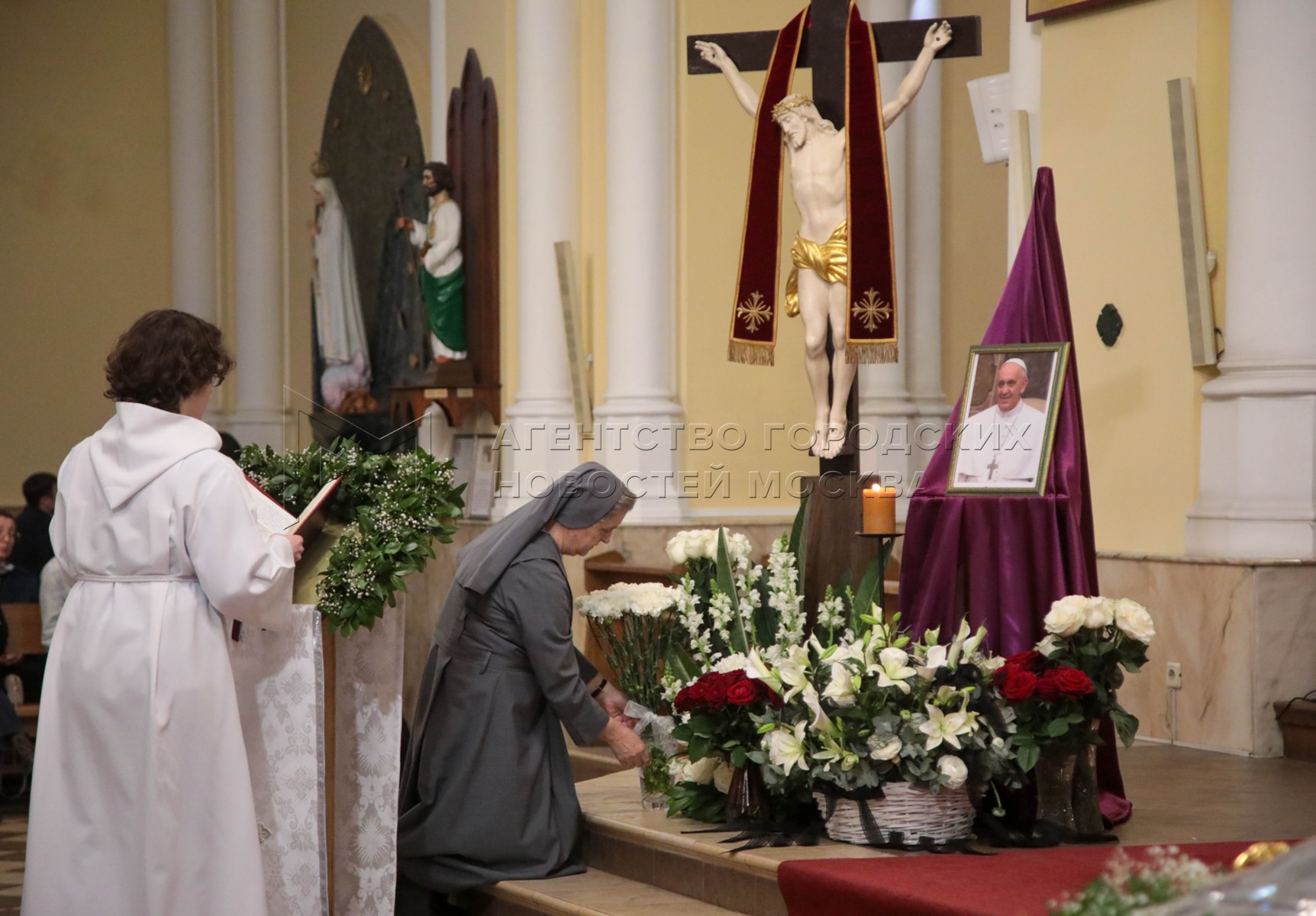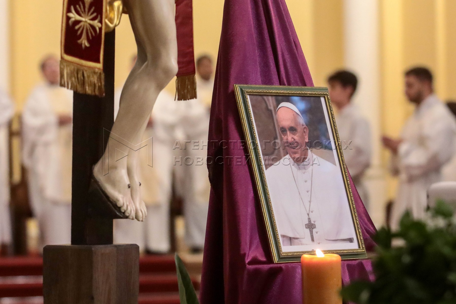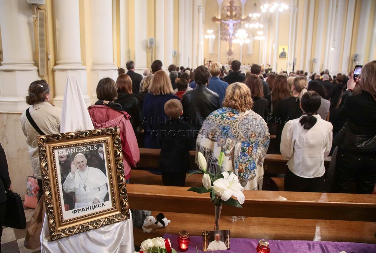 Святая месса в память об умершем папе римском Франциске в римско-католическом каф...