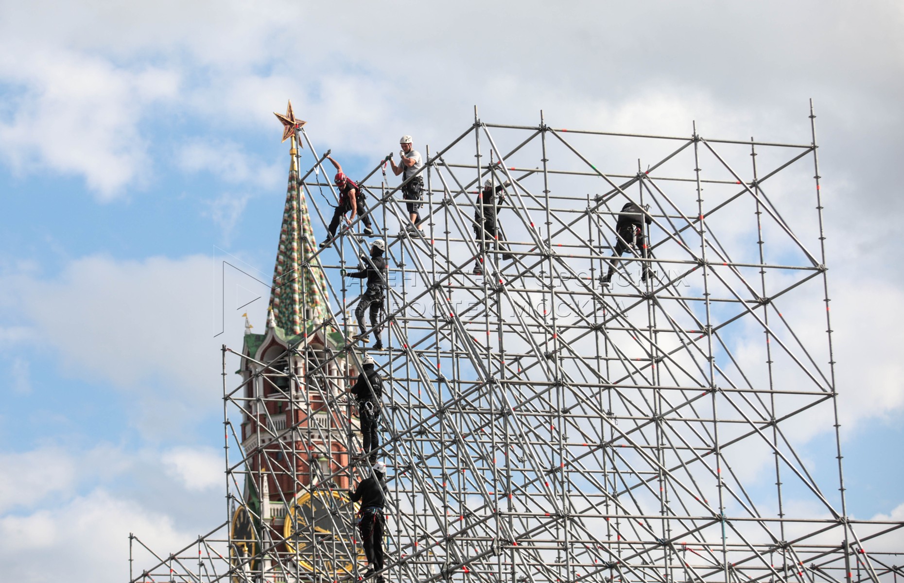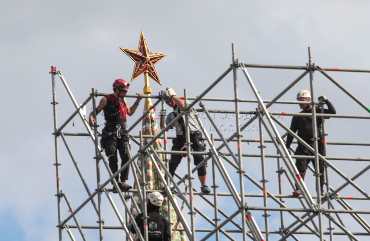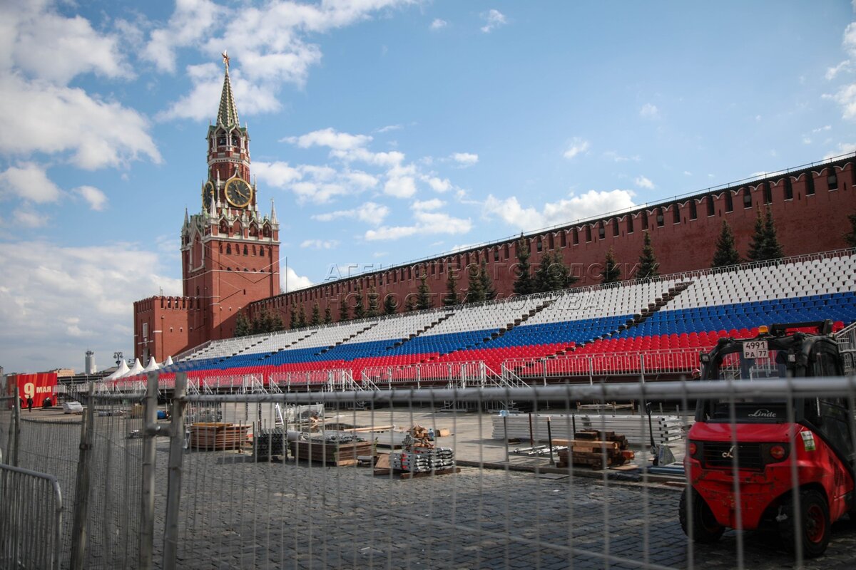 • Заголовок: Монтаж трибун на Красной площади в преддверии празднования 80-й годовщины Победы в ВОВ