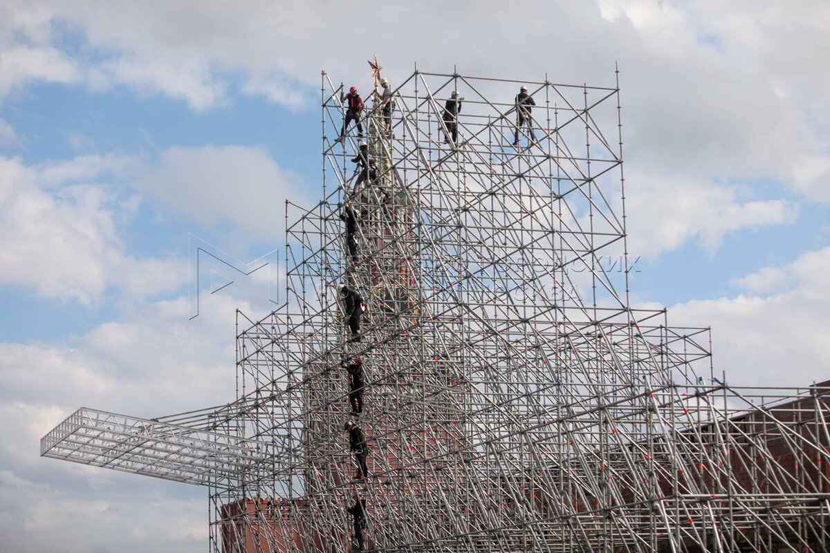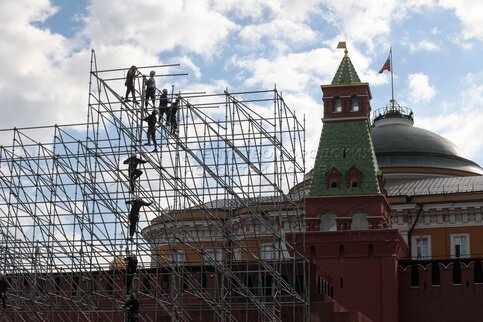 • Описание: Монтаж трибун на Красной площади в преддверии празднования 80-й годовщины Победы в Великой Отечественной войне.